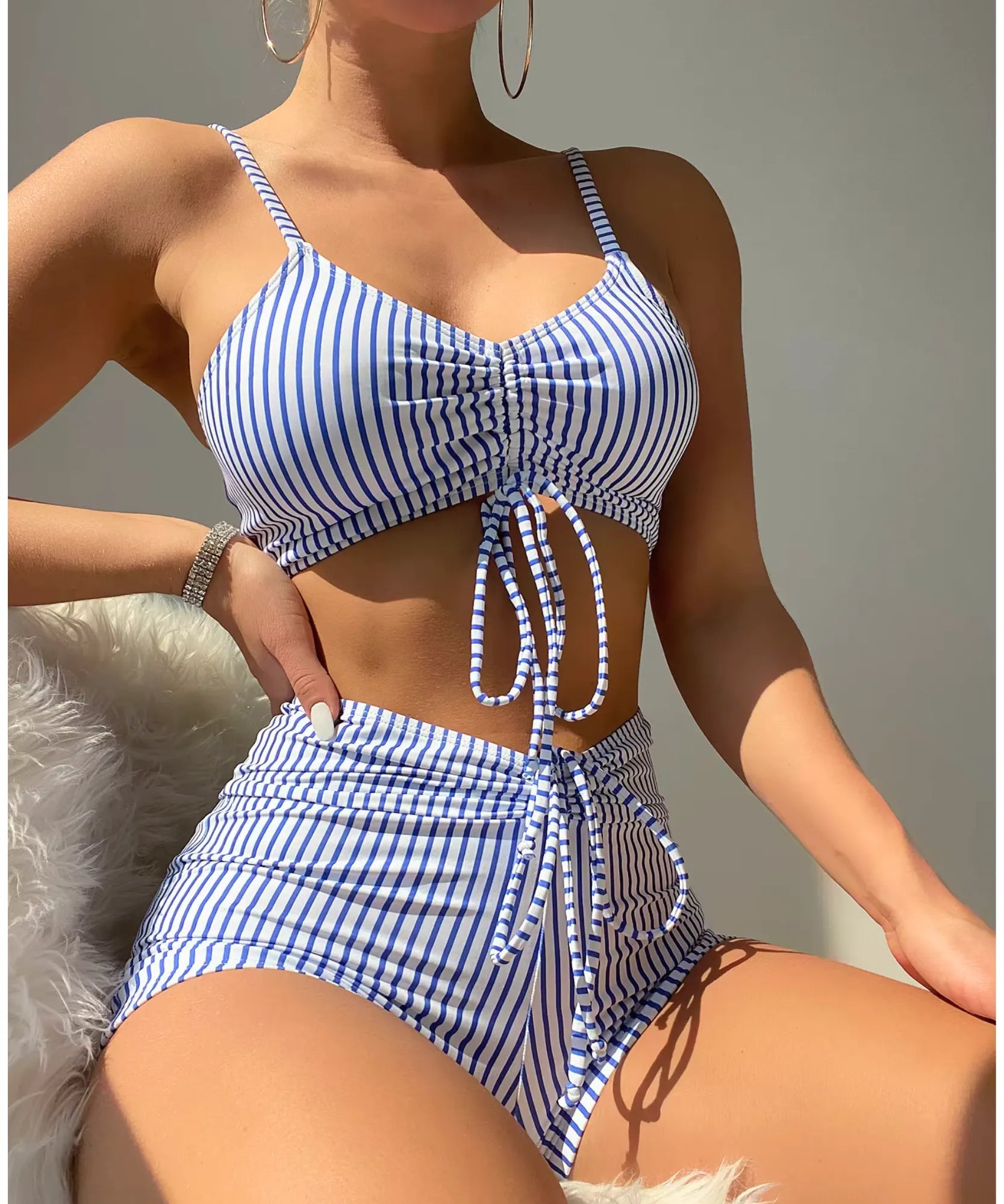 Este biquini shortinho listrado consegue ser sofisticado numa festa na piscina e prático para uma caminhada na areia.