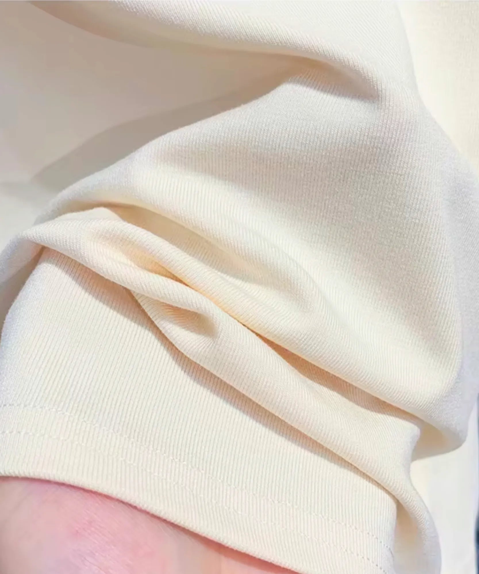 O acabamento da barra das mangas possui costura dupla invisível, impedindo que enrole ou perca a forma.