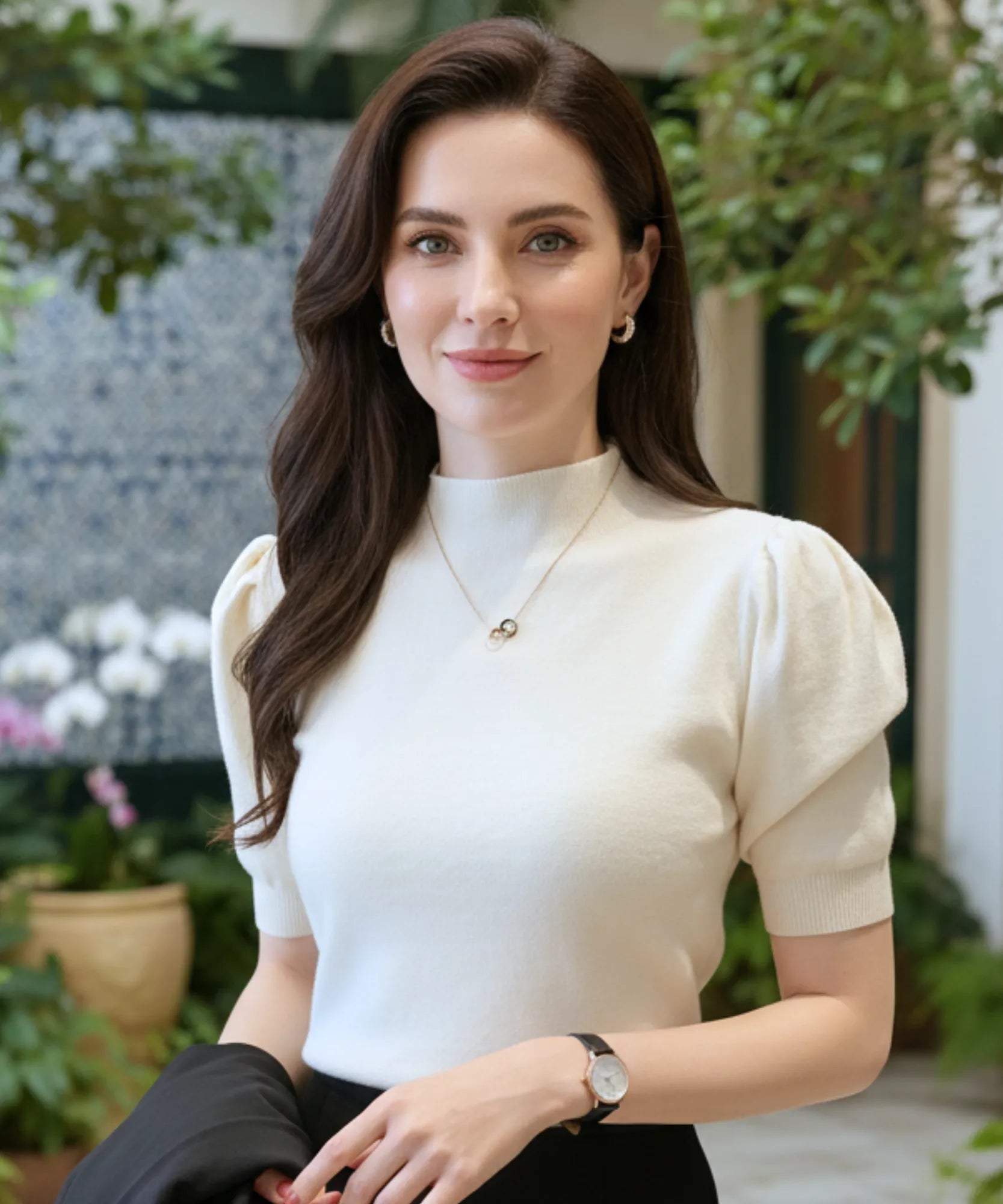 Talvez o detalhe que mais chama atenção seja o equilíbrio entre a manga bufante leve e a gola alta com estrutura. Não é exagerado, mas também não passa despercebido.