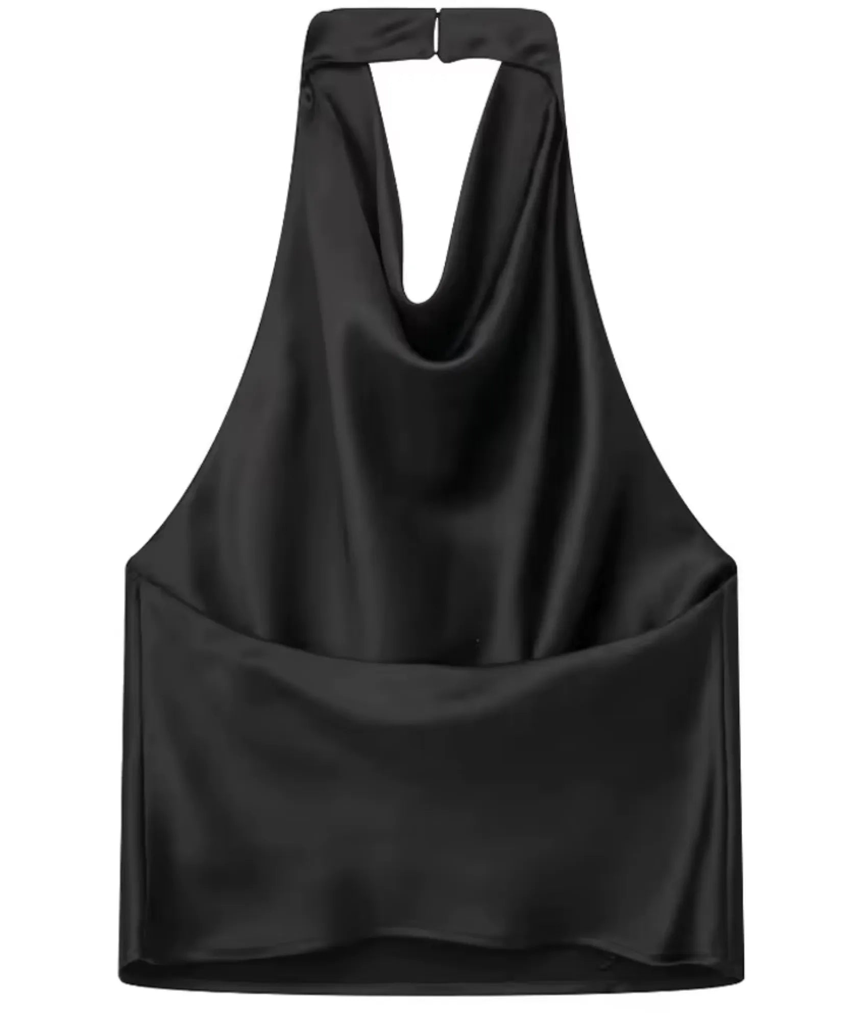A gola drapeada, combinada ao cetim acetinado, entrega uma composição com brilho delicado e caimento que transforma o look em segundos.