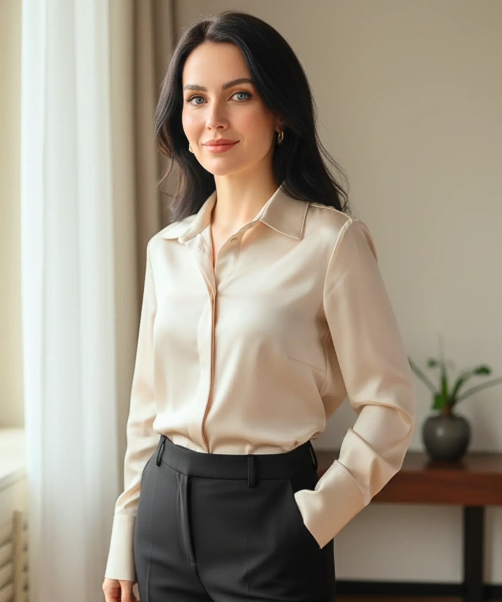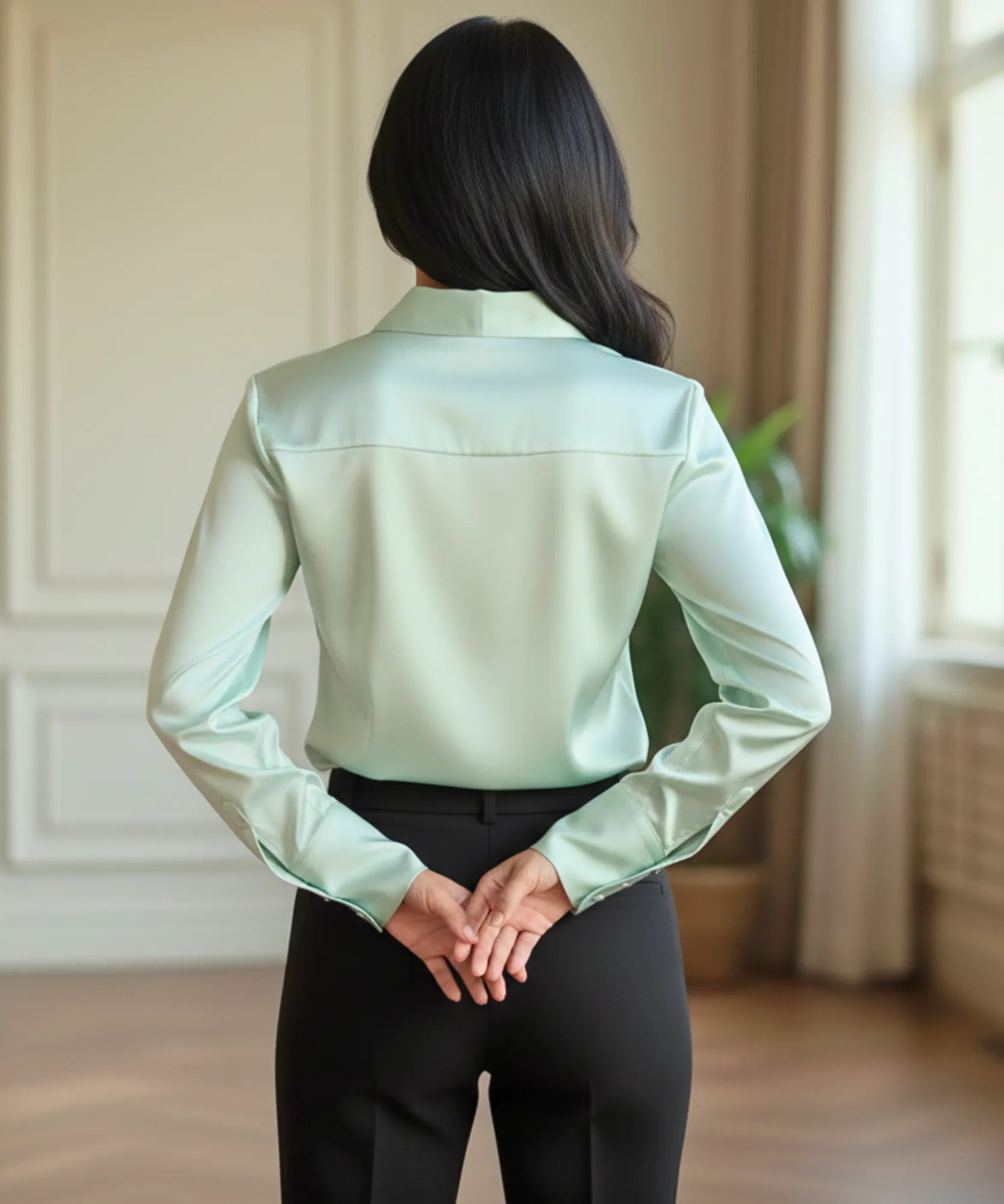 A blusa social feminina manga longa seda encaixa bem em dias de trabalho, reuniões importantes ou momentos em que a composição pede algo mais alinhado.