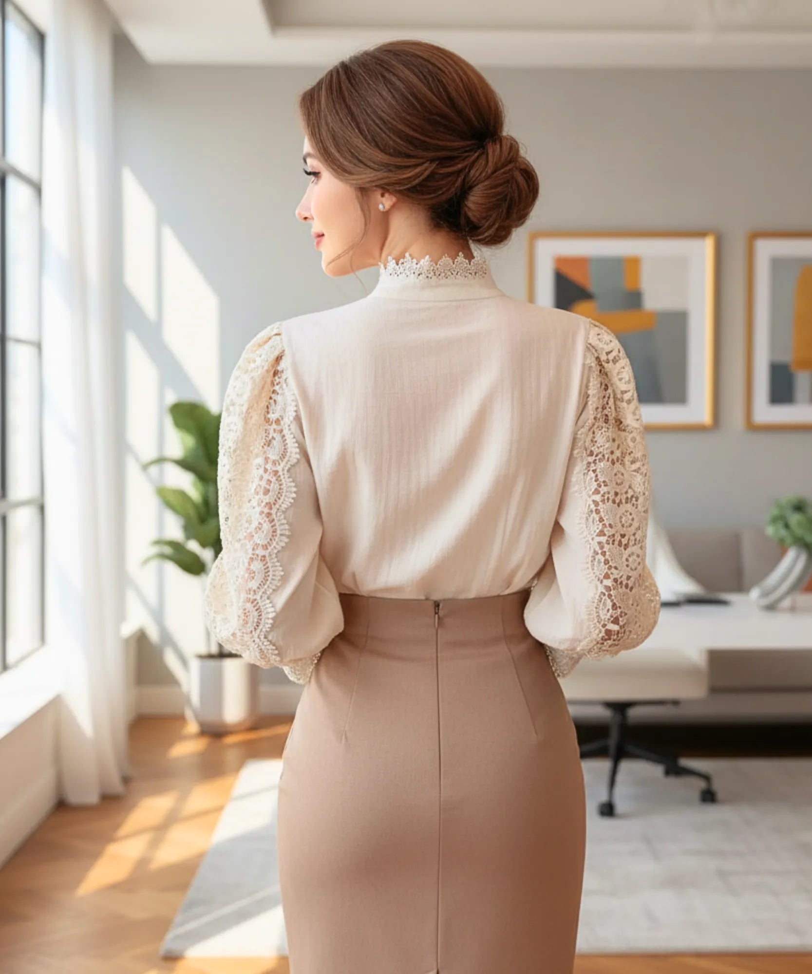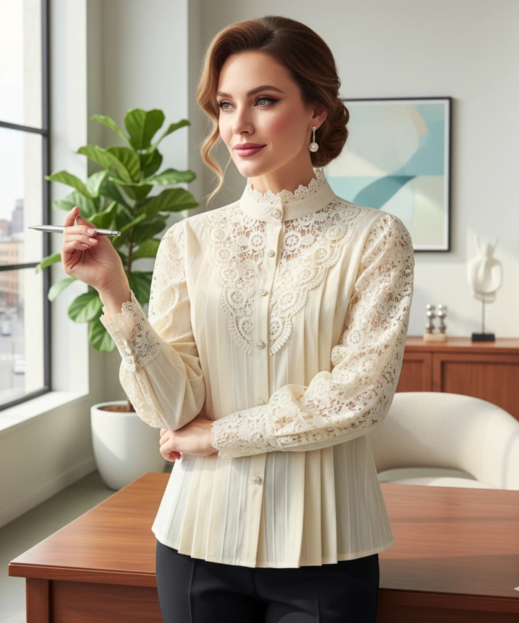 A blusa social feminina renda com manga bufante e gola alta valoriza o visual com uma mistura incrível de romantismo, elegância e estilo vintage.