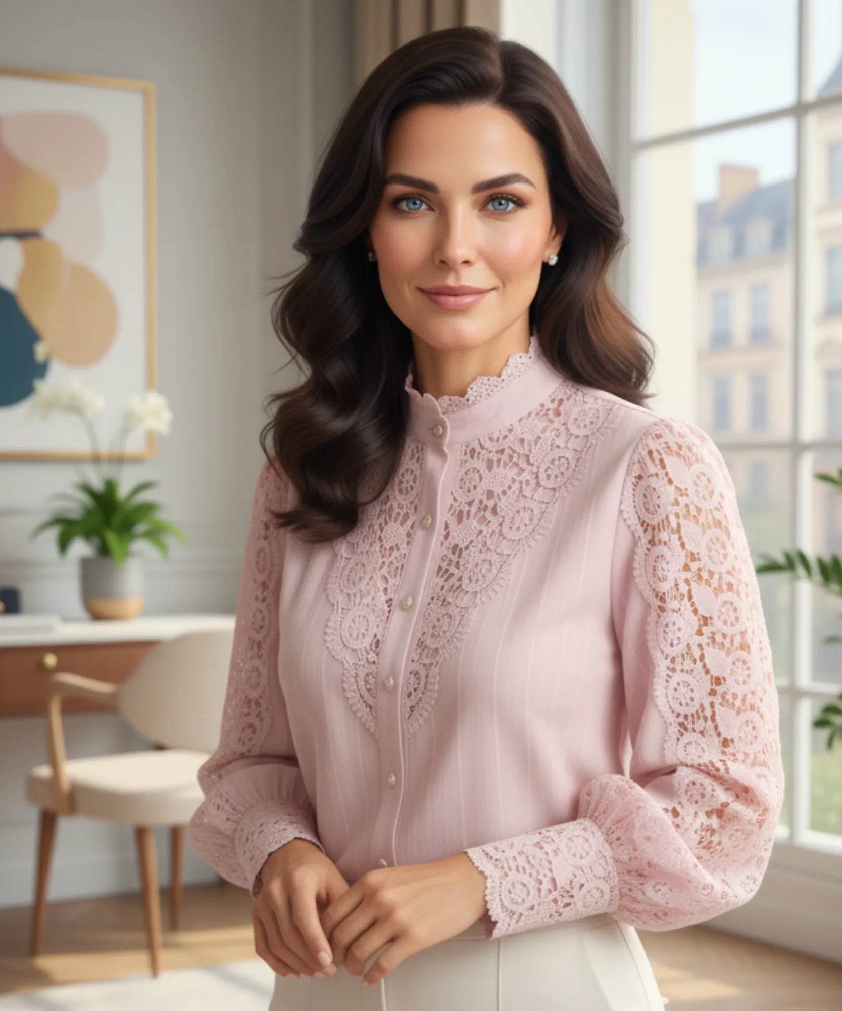 A manga bufante traz volume com suavidade, o punho ajustado com renda cria contraste, e a gola alta com recorte e botão central dá aquele toque de requinte vintage.