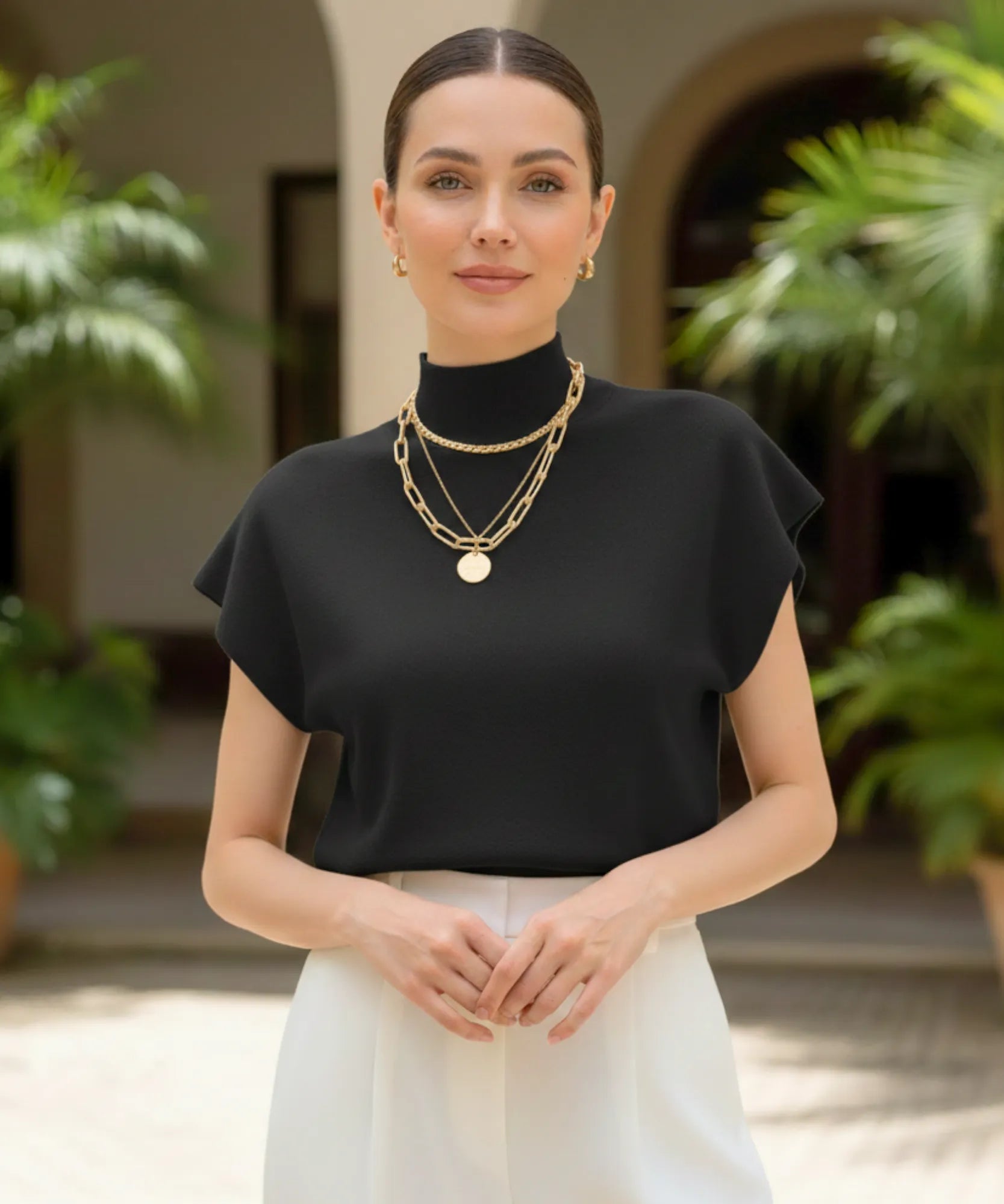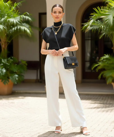 Gola alta estruturada que valoriza o colo e alonga a silhueta