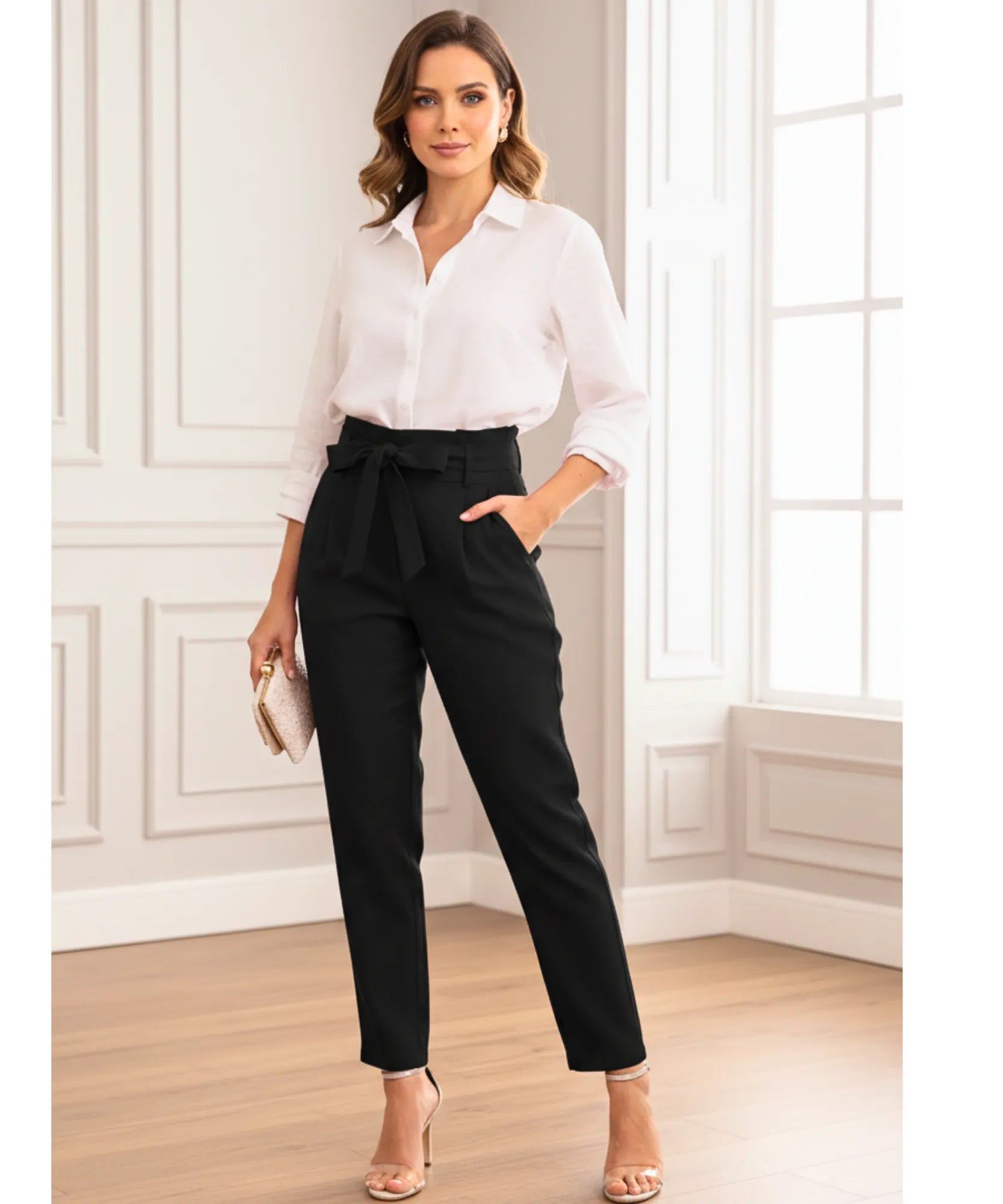 A cintura alta marca sem apertar, o cinto adiciona um toque autêntico de elegância, e a modelagem reta traz aquele ar profissional sem parecer engessado.