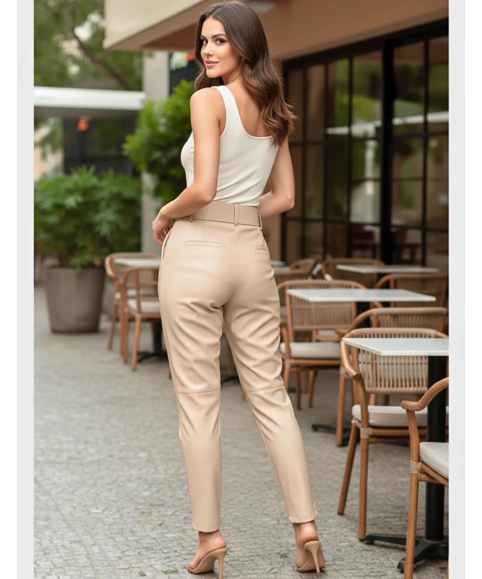 O couro ecológico usado nesta calça feminina alfaiataria tem textura macia e resistência superior.