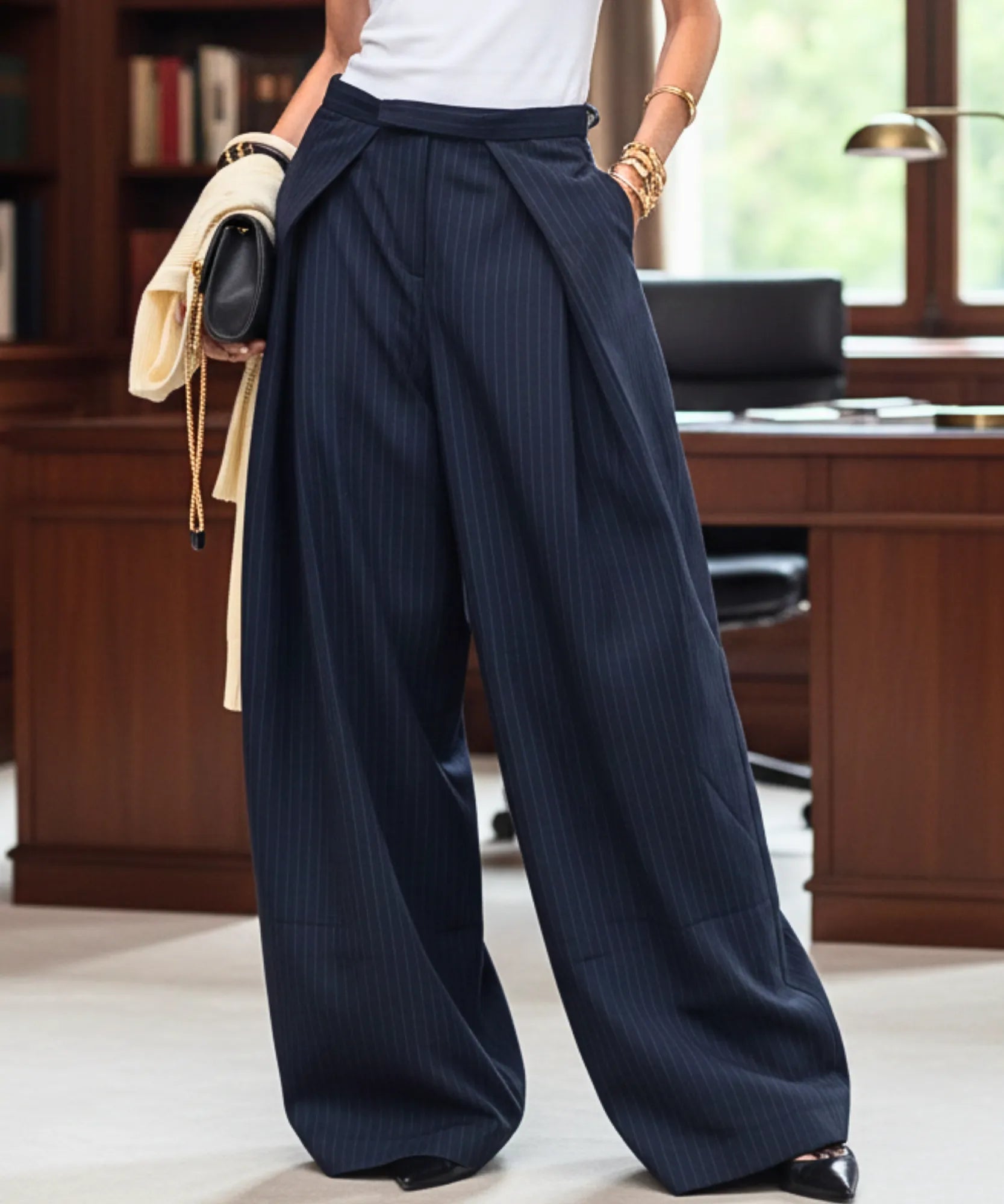 As pregas frontais estrategicamente posicionadas criam volume controlado que alonga a silhueta, enquanto a cintura alta define proporções que favorecem desde corpos mais retos até silhuetas curvilíneas.