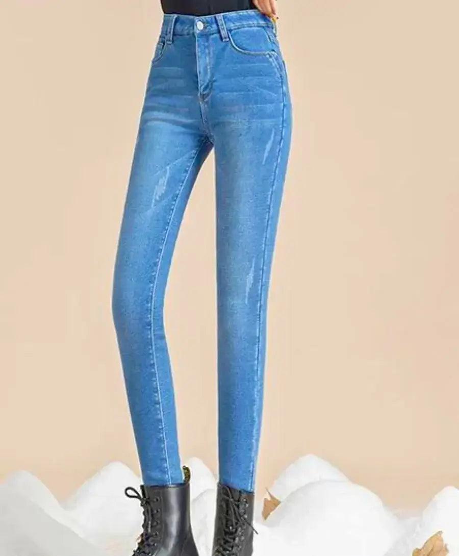 Calça Térmica Feminina Jeans skinny retro azul com interior de pelúcia, ideal para inverno e neve, oferecendo calor e estilo.