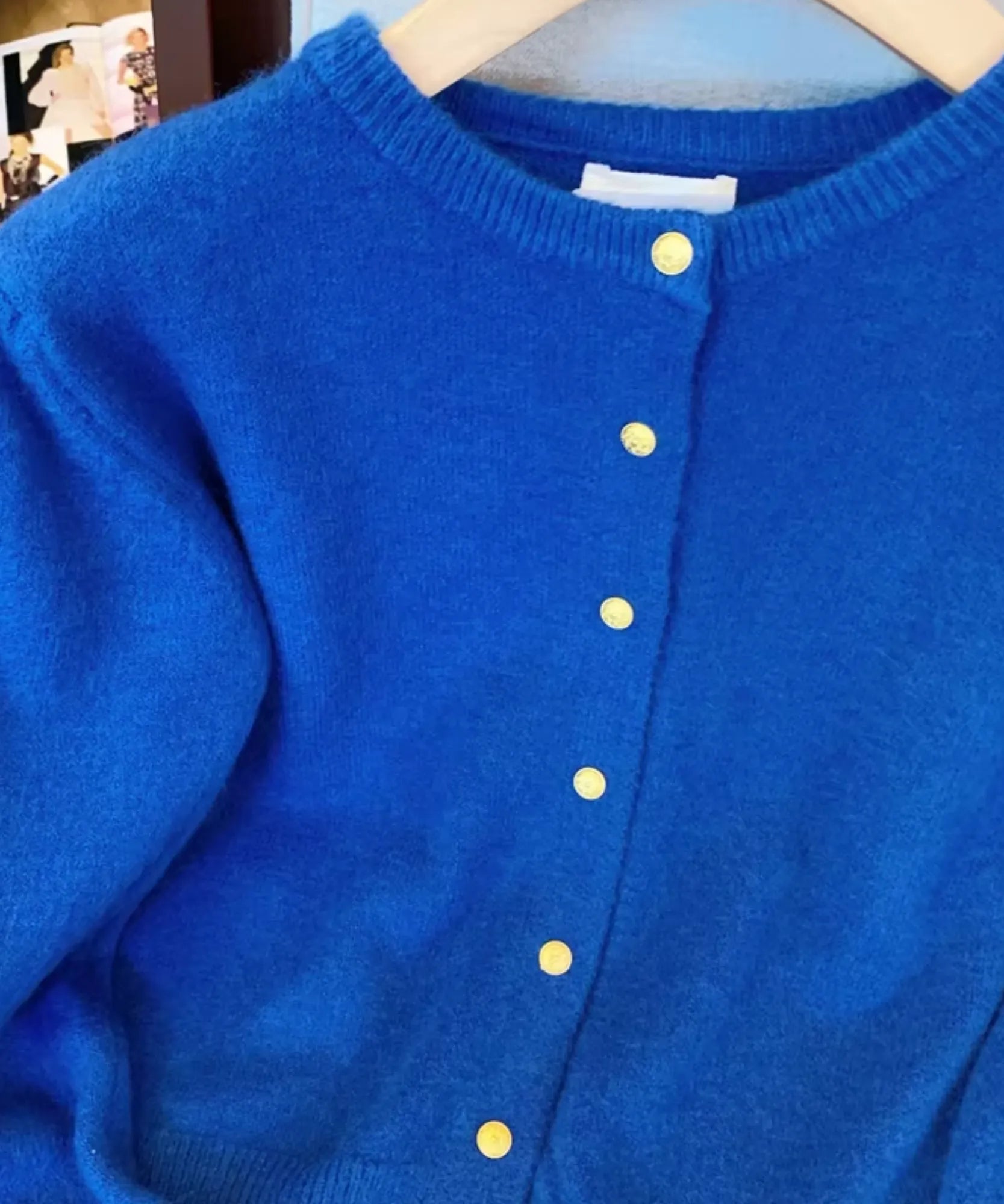 Talvez o detalhe que mais chama atenção sejam os botões em tom dourado que contrastam perfeitamente com as cores vibrantes do tricot. É aquele diferencial sutil que eleva o look inteiro.
