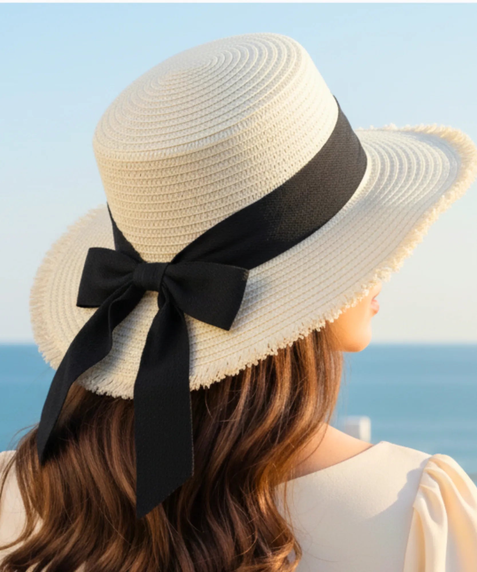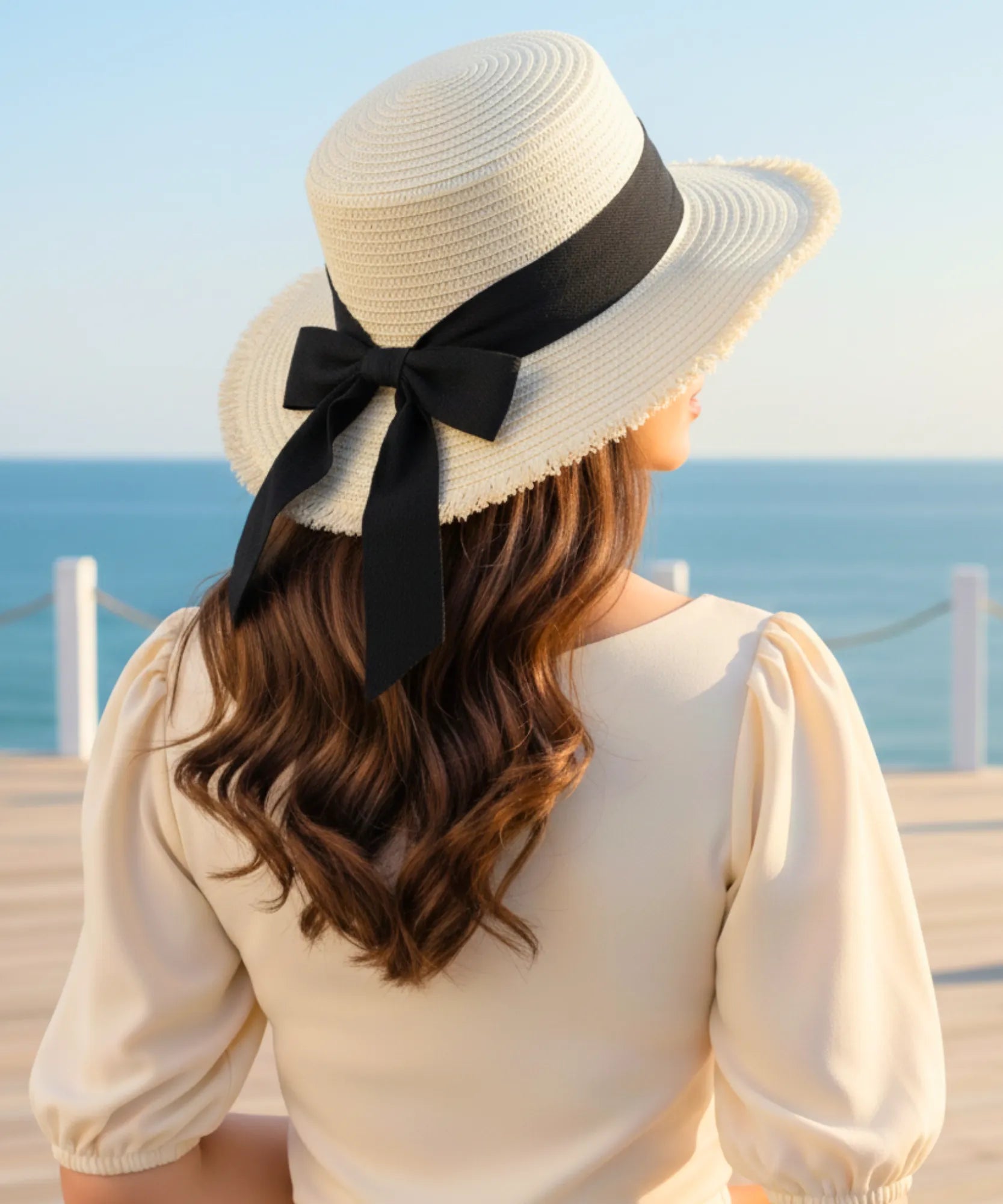 O charme concentra-se na fita preta generosa que envolve a copa. O contraste cromático entre preto intenso e bege natural cria ponto focal elegante. As pontas longas permitem amarrar de diferentes formas - laço lateral clássico, nó traseiro discreto ou até deixar solto para movimento.