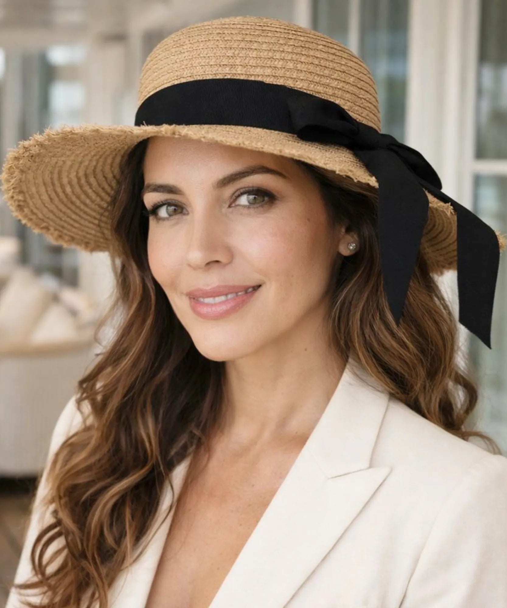 A fita preta com laço lateral contrasta elegantemente com o bege natural da palha. O posicionamento lateral do laço mantém sofisticação adulta, permitindo amarrar de diferentes formas conforme preferência pessoal.