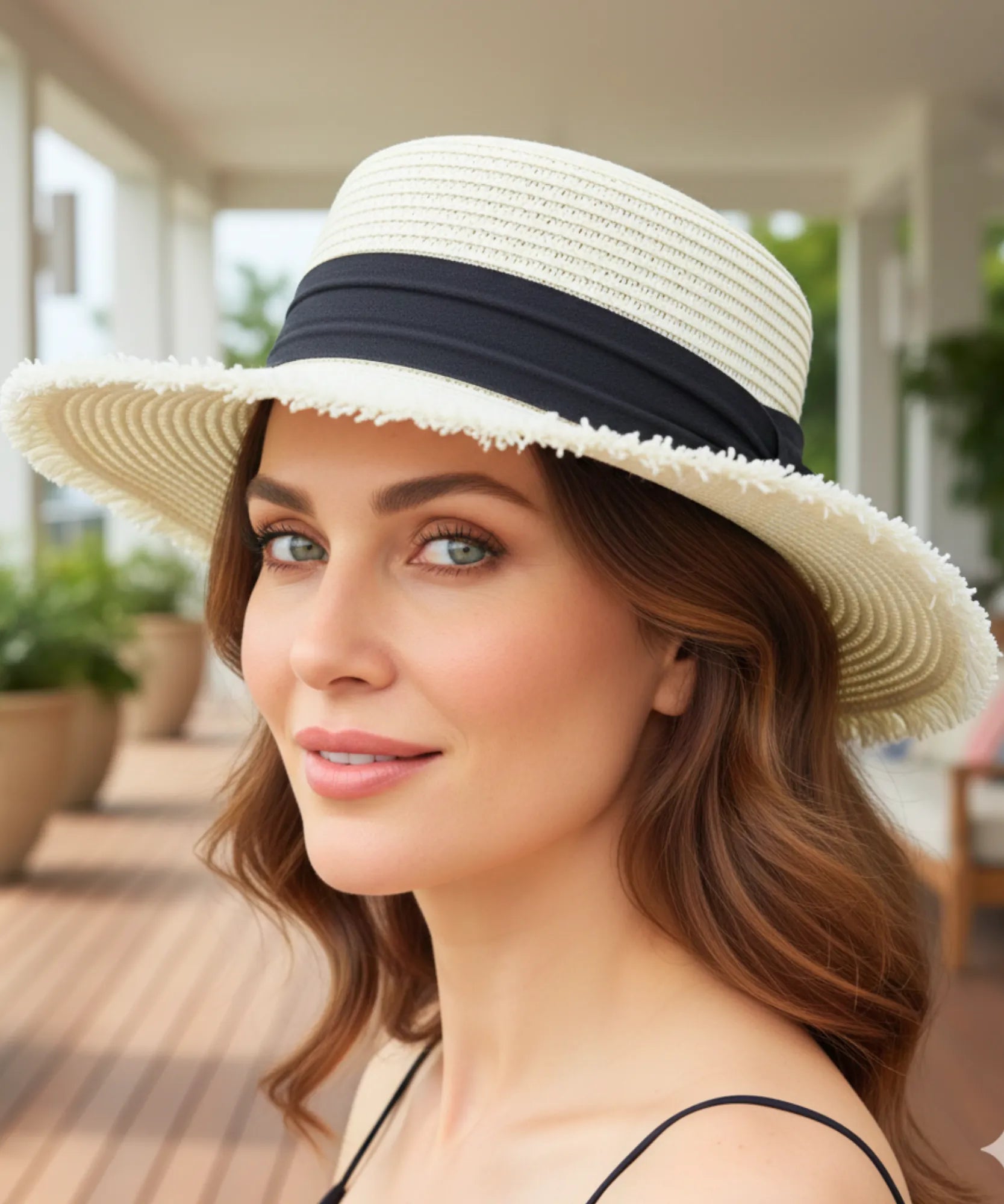 A copa plana estruturada segue tradição dos chapéus boater que ganharam popularidade no início do século XX. O formato atemporal funciona perfeitamente hoje, especialmente em contextos de praia e verão onde elegância casual é desejada.