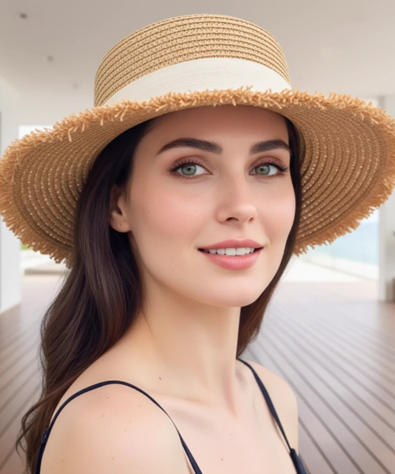 A palha natural trançada cria textura rica e visual orgânico, enquanto a aba reta com bordas desfiadas adiciona toque rústico-chic que diferencia completamente de modelos industrializados.