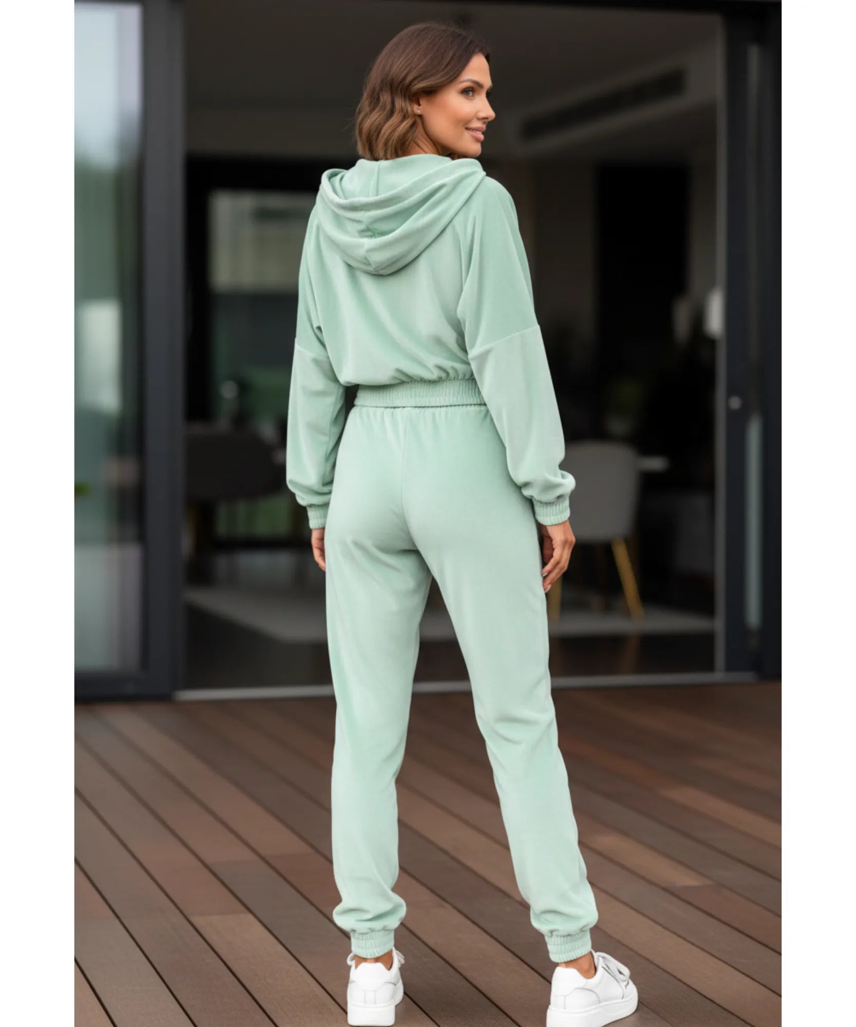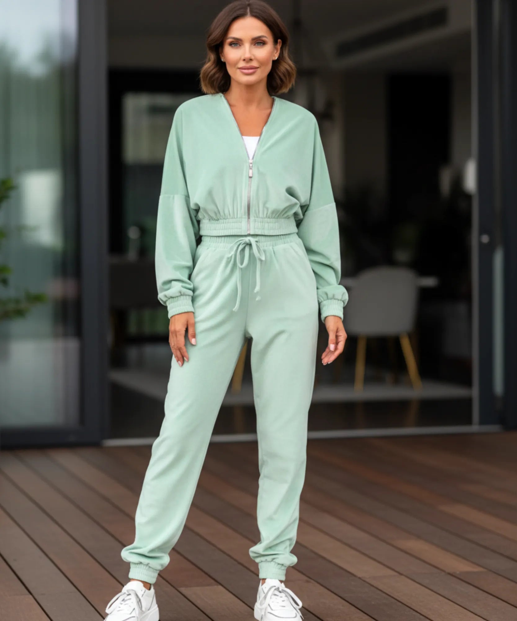 A jaqueta cropped com capuz e zíper frontal combina com a calça jogger de cós alto elástico num conjunto que parece ter sido feito exatamente pra isso.