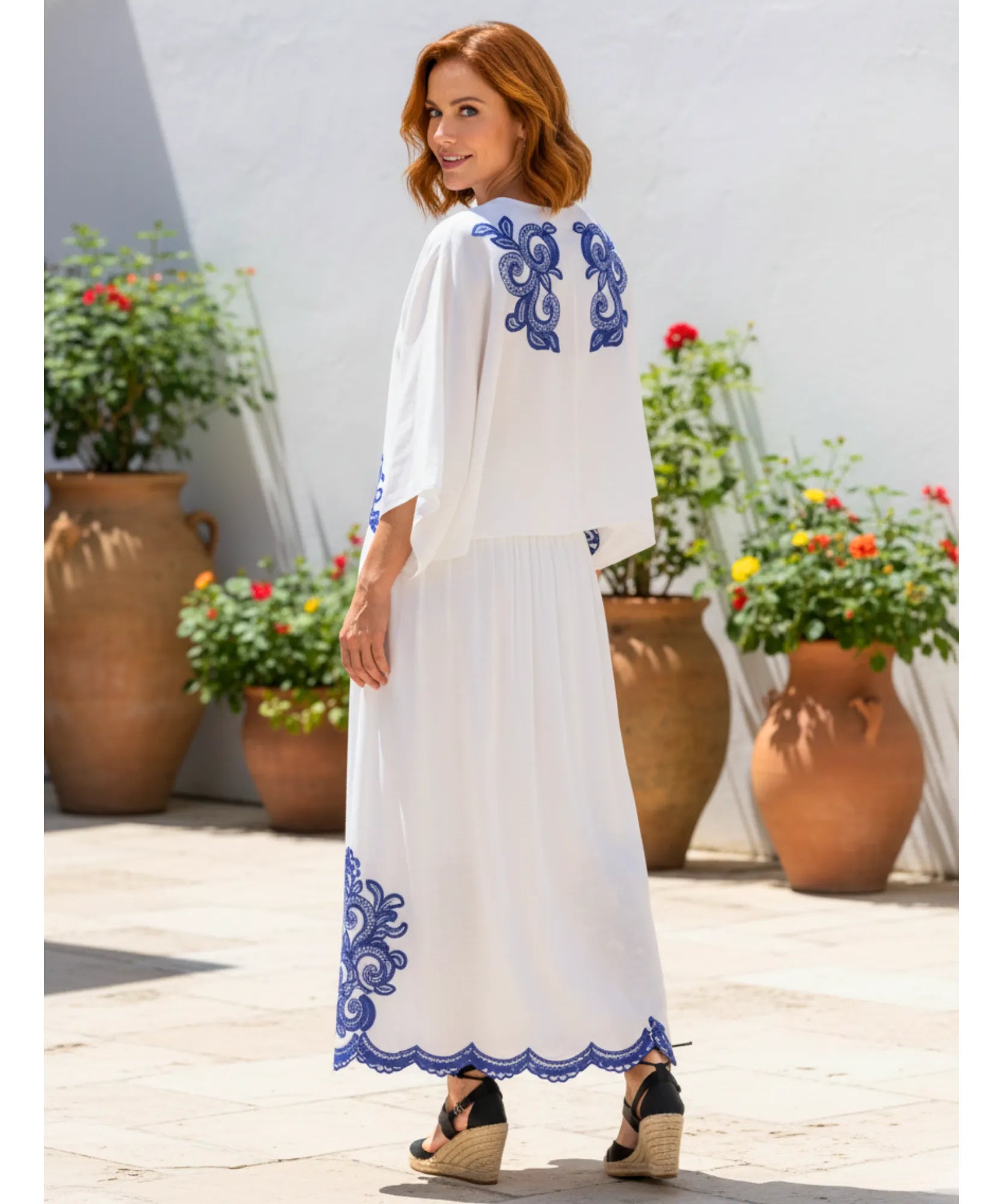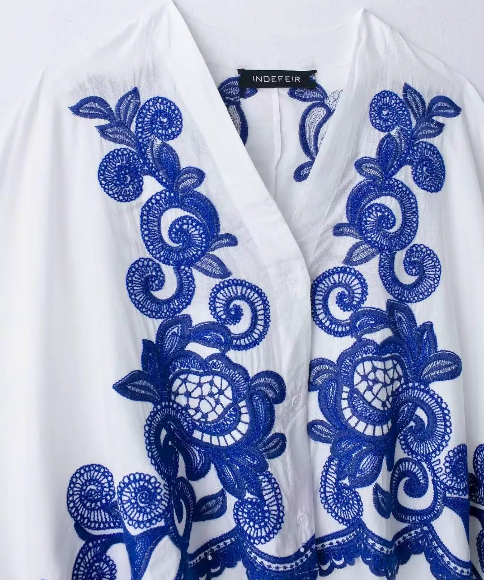 Os bordados azuis contrastam com o tecido branco, criando uma composição sofisticada sem precisar de muito esforço.