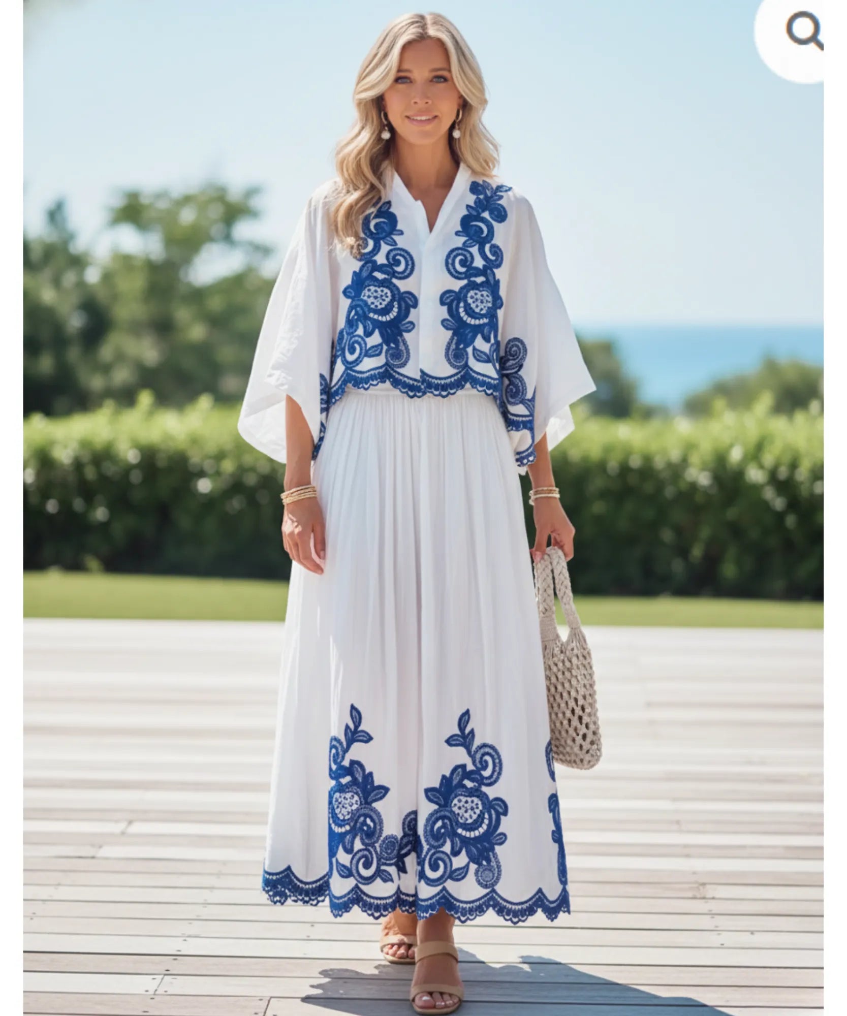 A blusa tem manga morcego que traz amplitude e movimento, enquanto a saia plissada midi garante elegância atemporal.