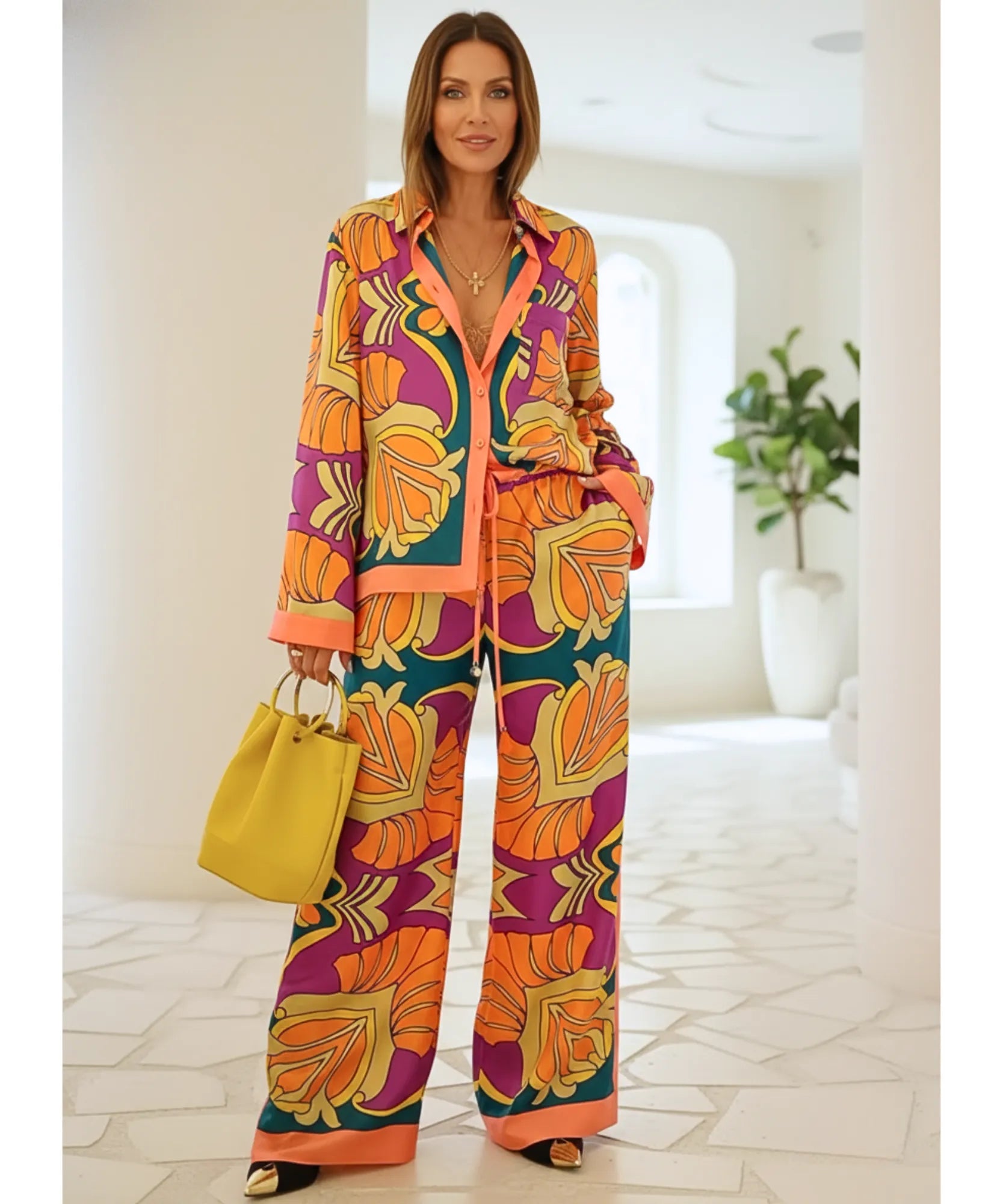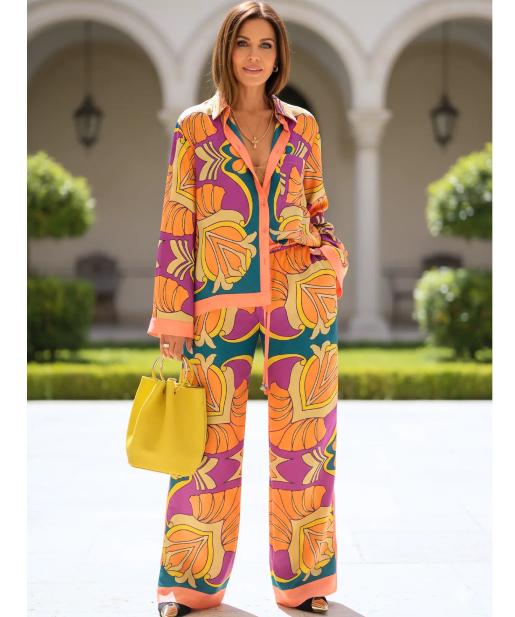 Este conjunto feminino calça e blusa traz uma estampa tropical exclusiva que realça personalidade e autenticidade em cada detalhe.