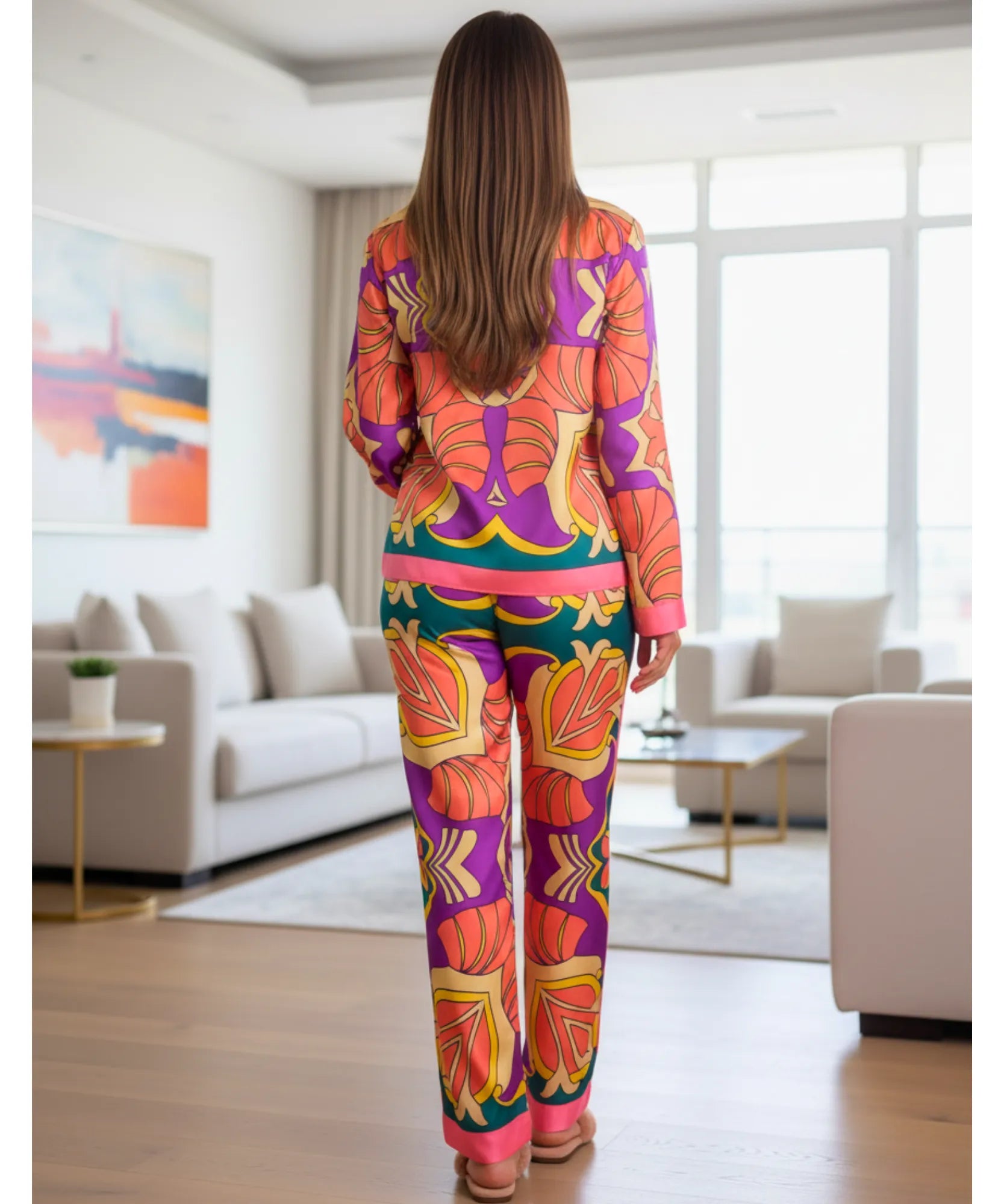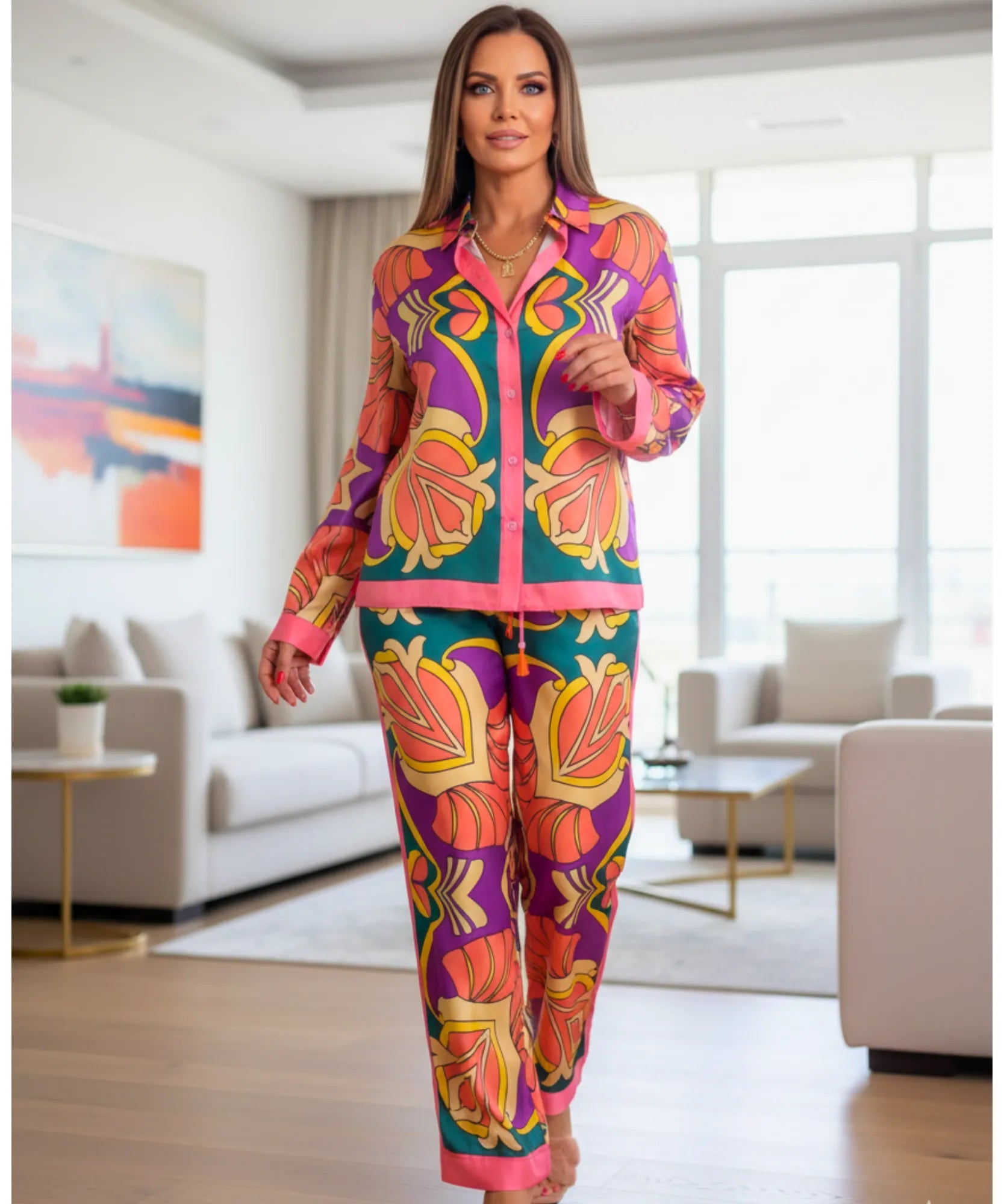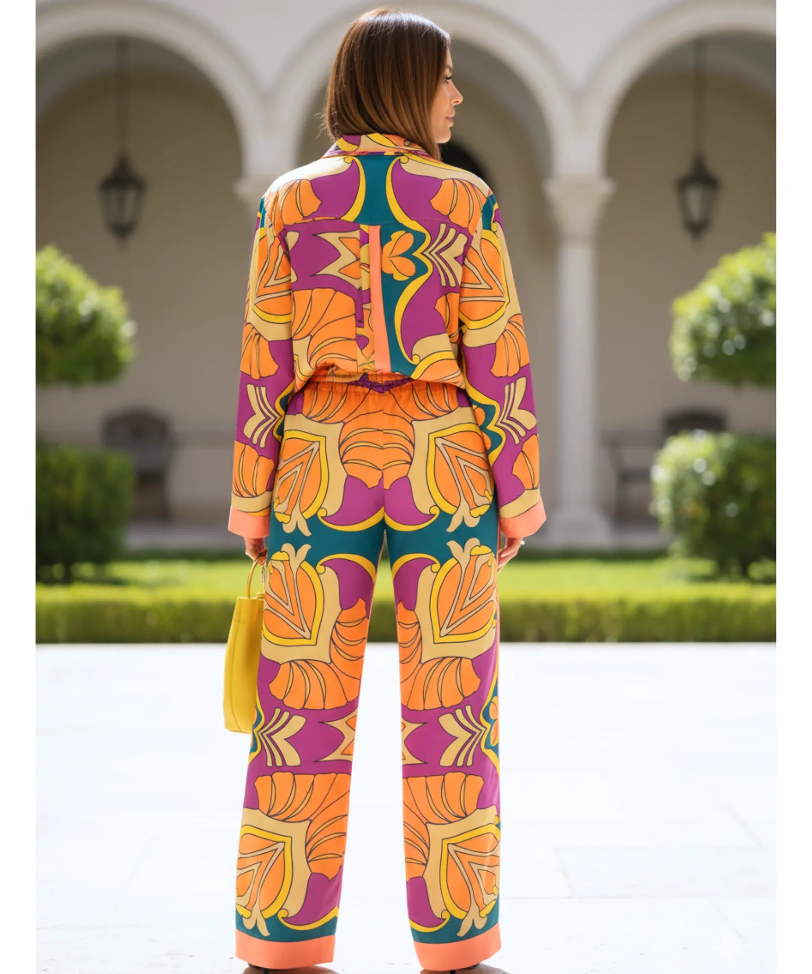 Talvez o detalhe que mais chama atenção seja a barra contrastante em todas as peças – punhos, barra da blusa e barra da calça recebem acabamento em tom coral que harmoniza com a estampa principal.