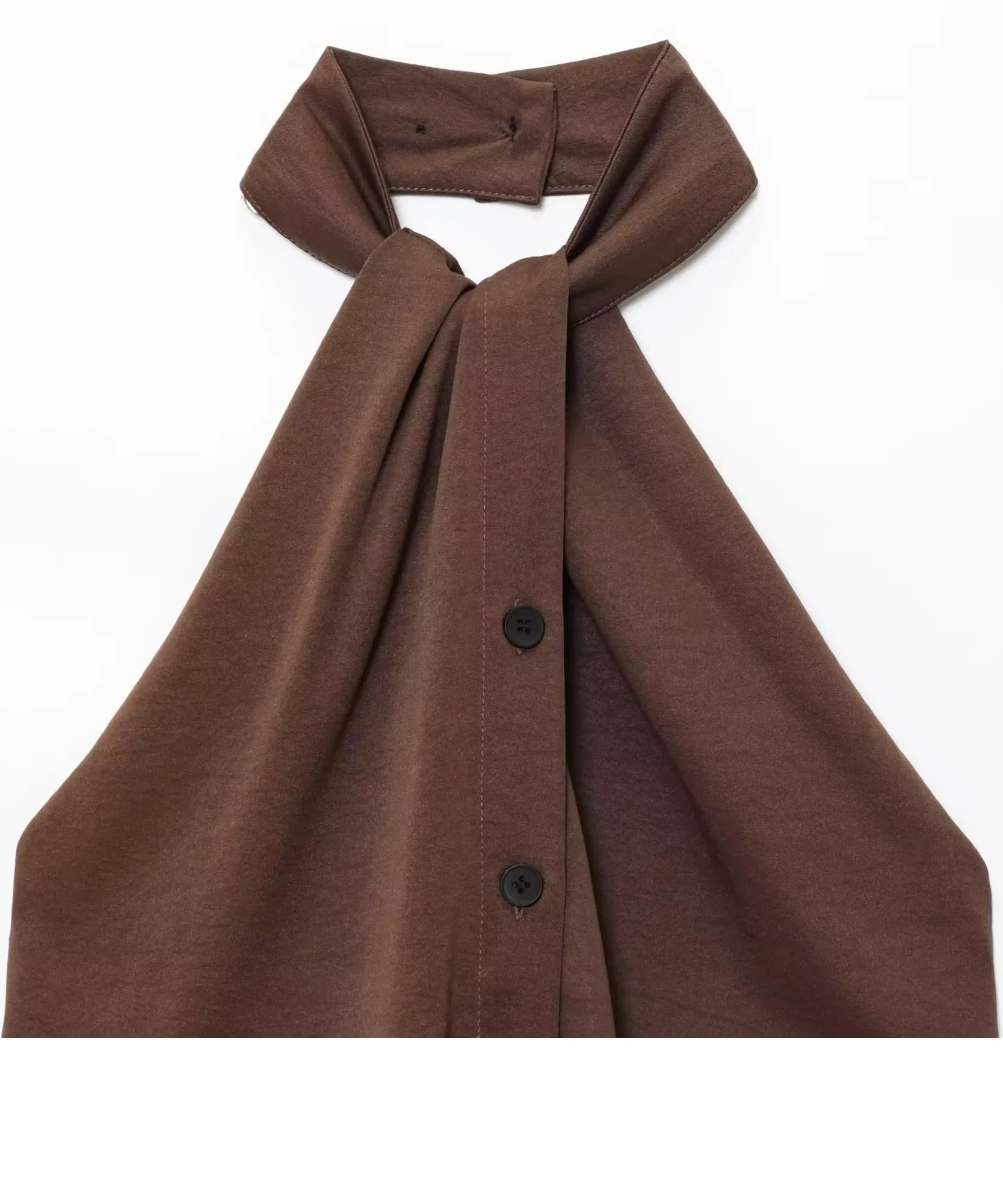 A amarração no pescoço se ajusta facilmente, criando caimento diferente a cada uso. As costas abertas deixam a peça leve e respirável mesmo em dias quentes.