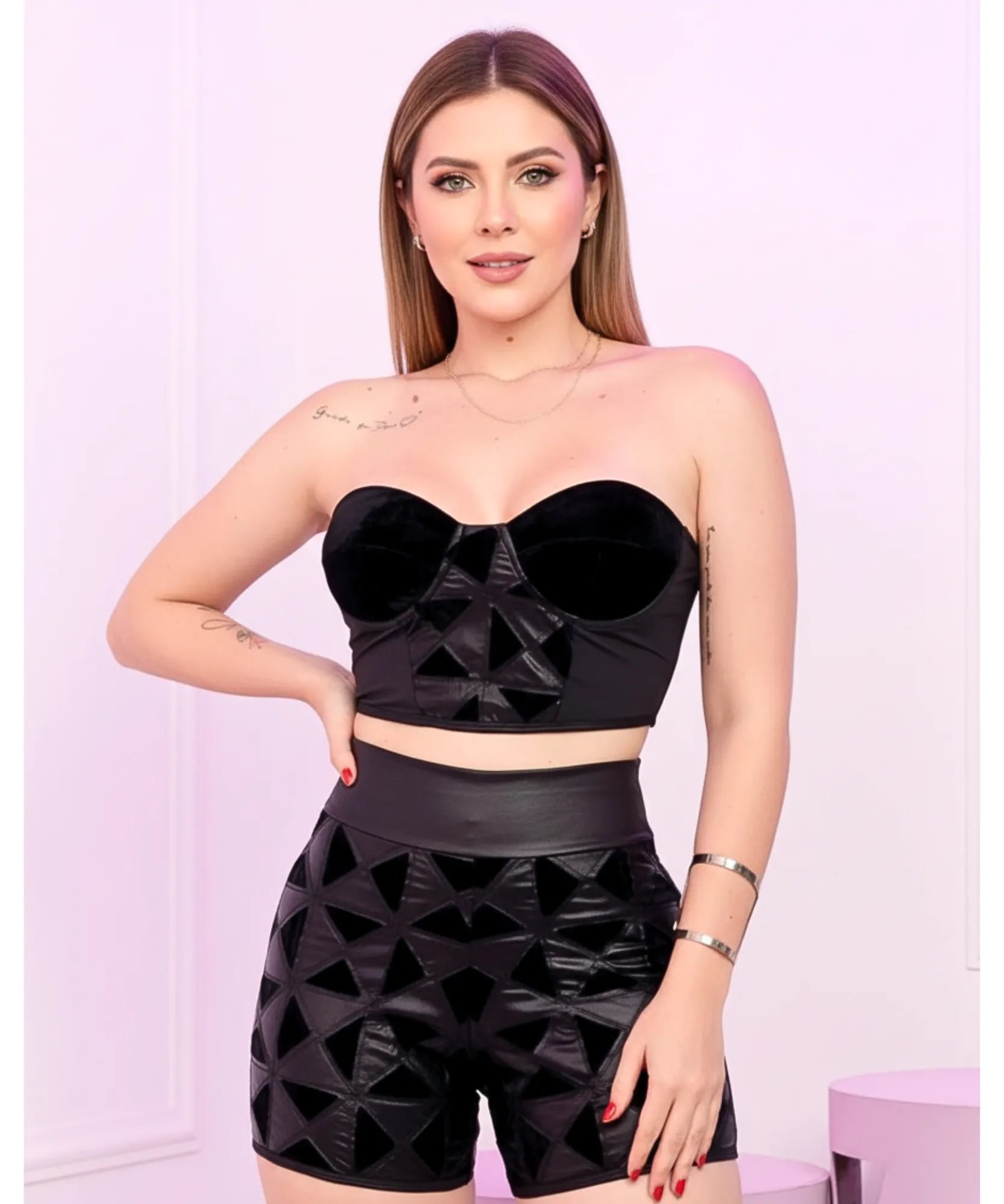 Talvez o charme esteja no cropped tomara que caia, que destaca o colo enquanto o short completa o visual com personalidade.