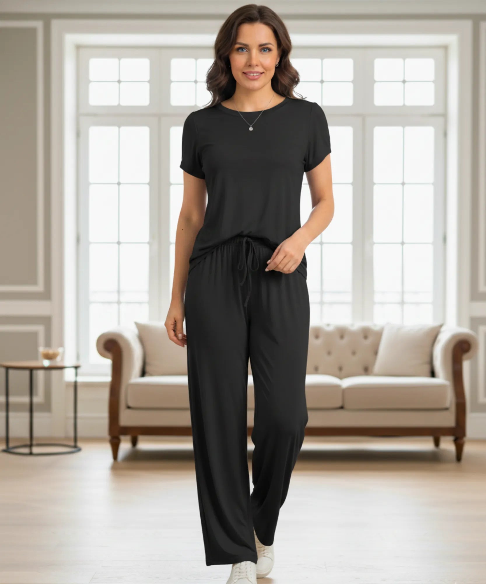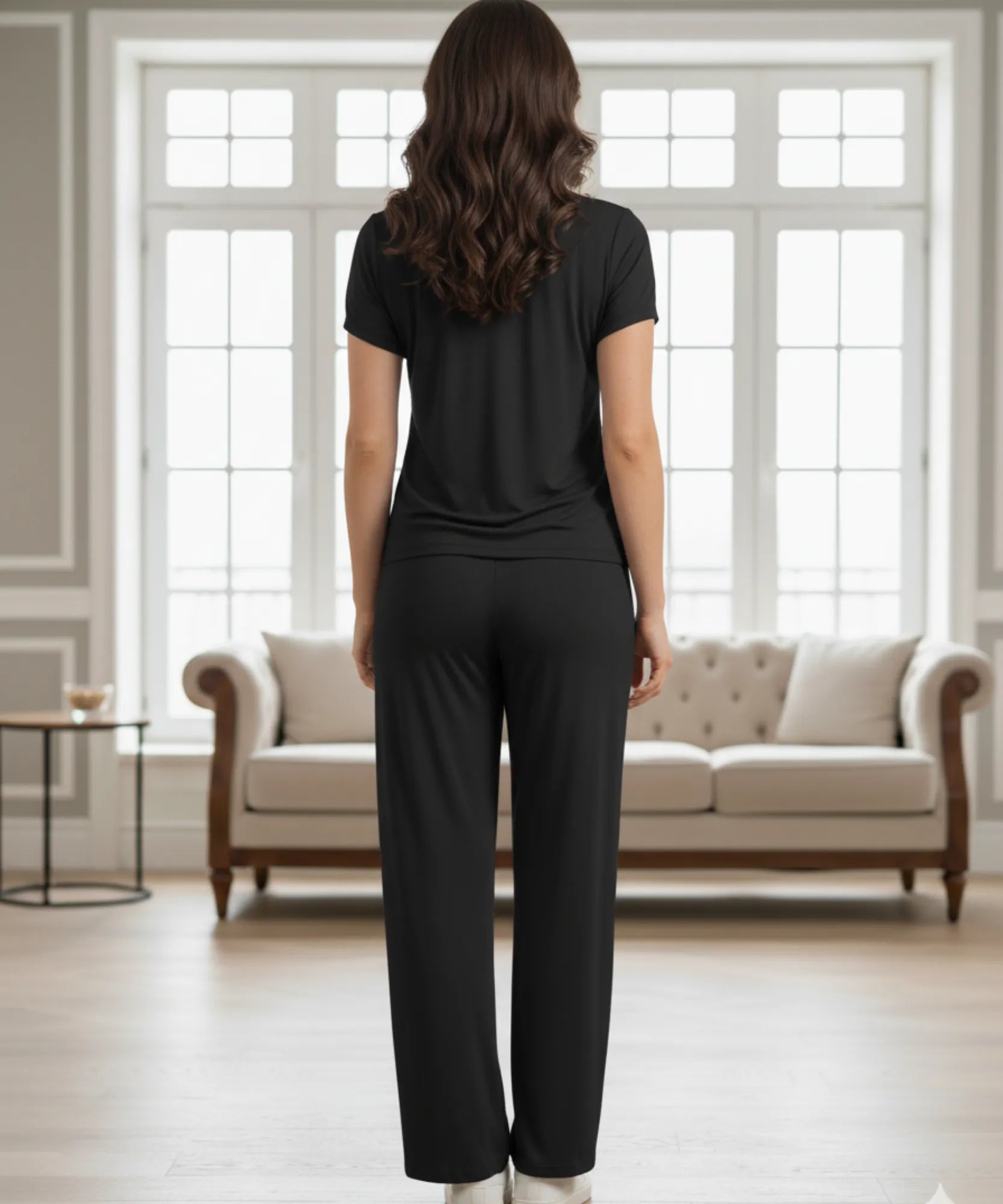 A blusa tem decote redondo clássico e manga curta que não aperta o braço, criando um visual despojado mas arrumado. Já a calça pantalona traz cintura com elástico embutido e cordão ajustável interno, garantindo aquele ajuste personalizado sem apertar a barriga.