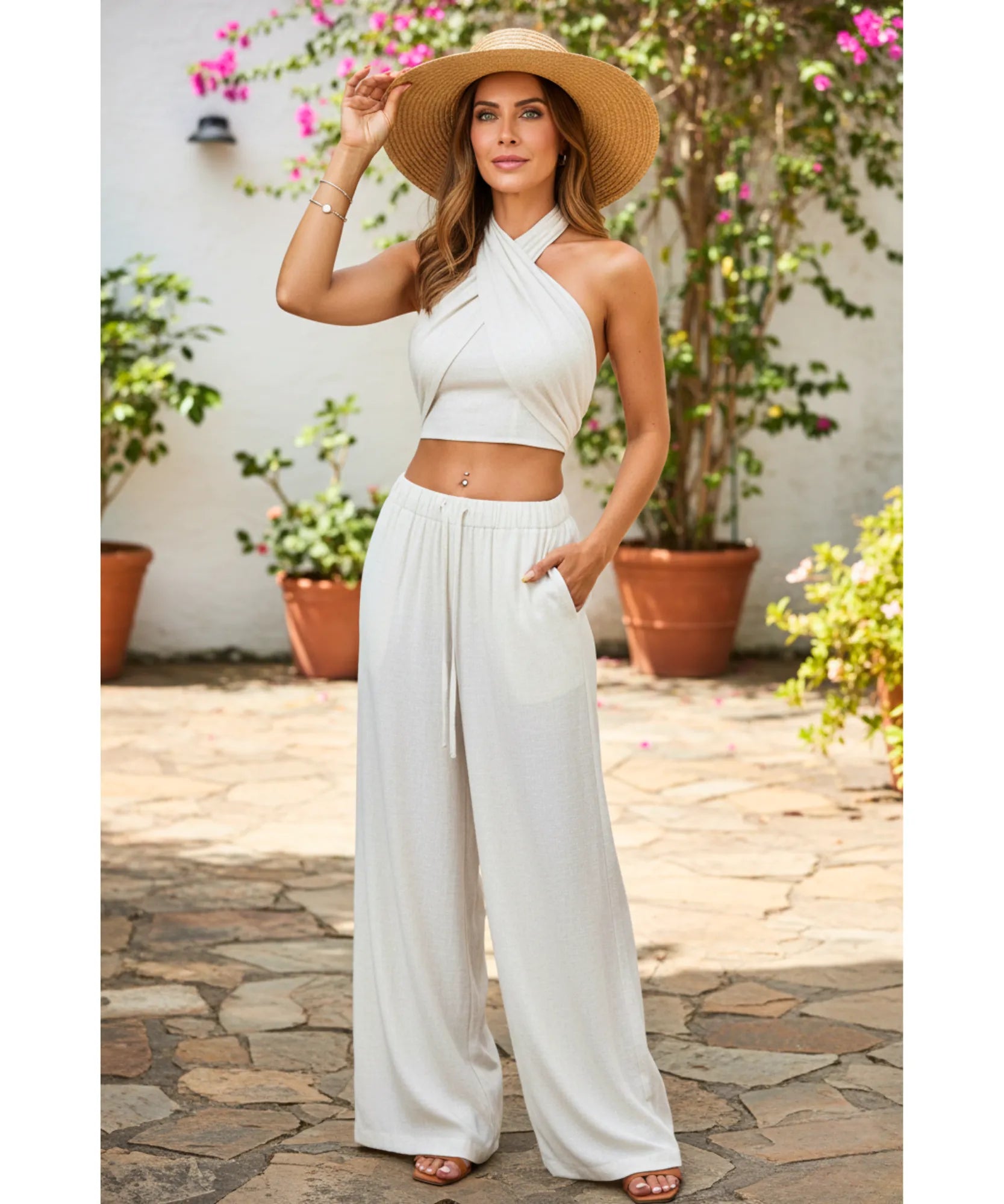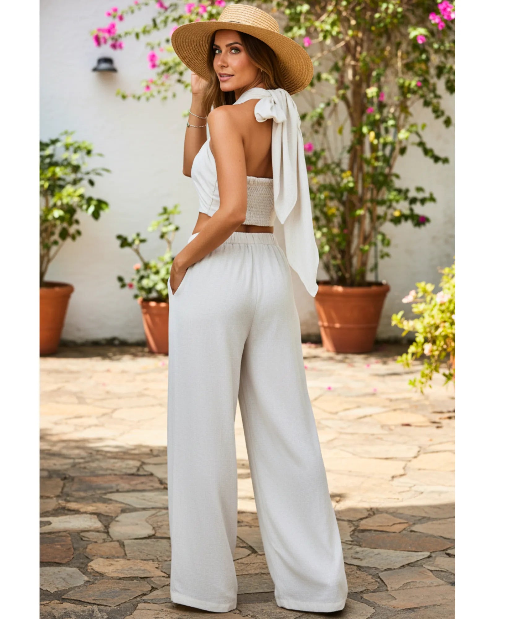 O cropped com amarração cruzada realça a silhueta feminina de forma única, enquanto a calça pantalona de cintura alta cria uma composição impecável.