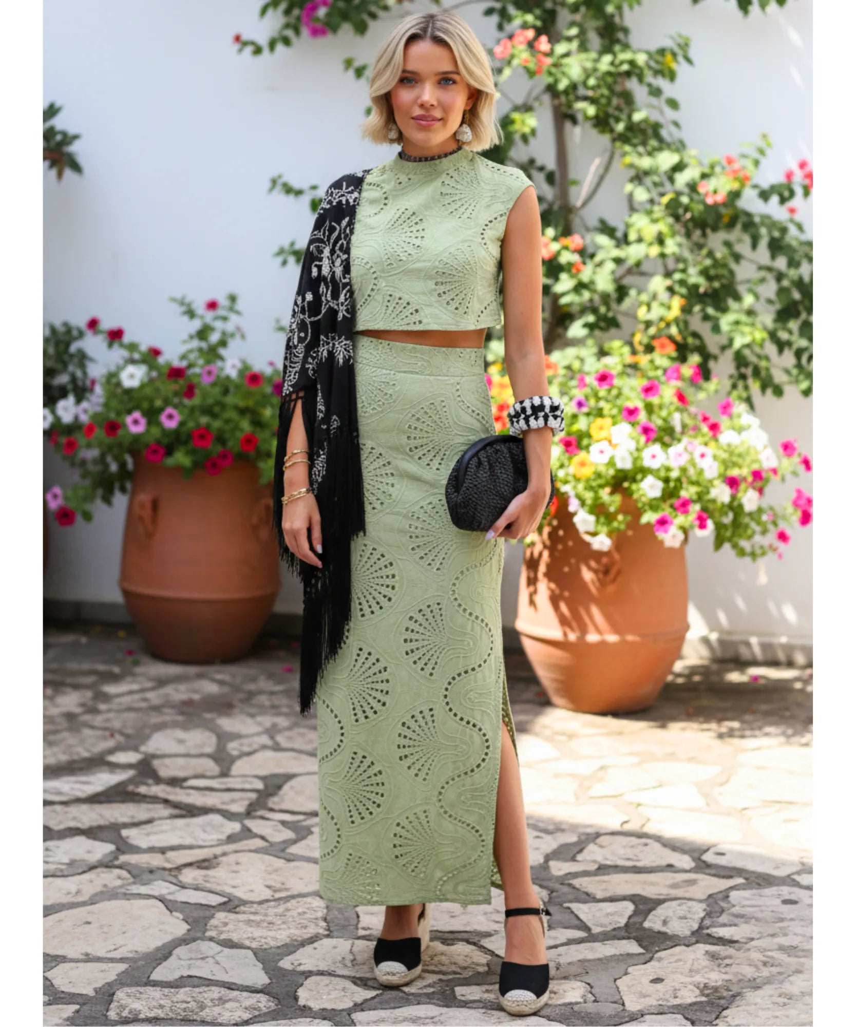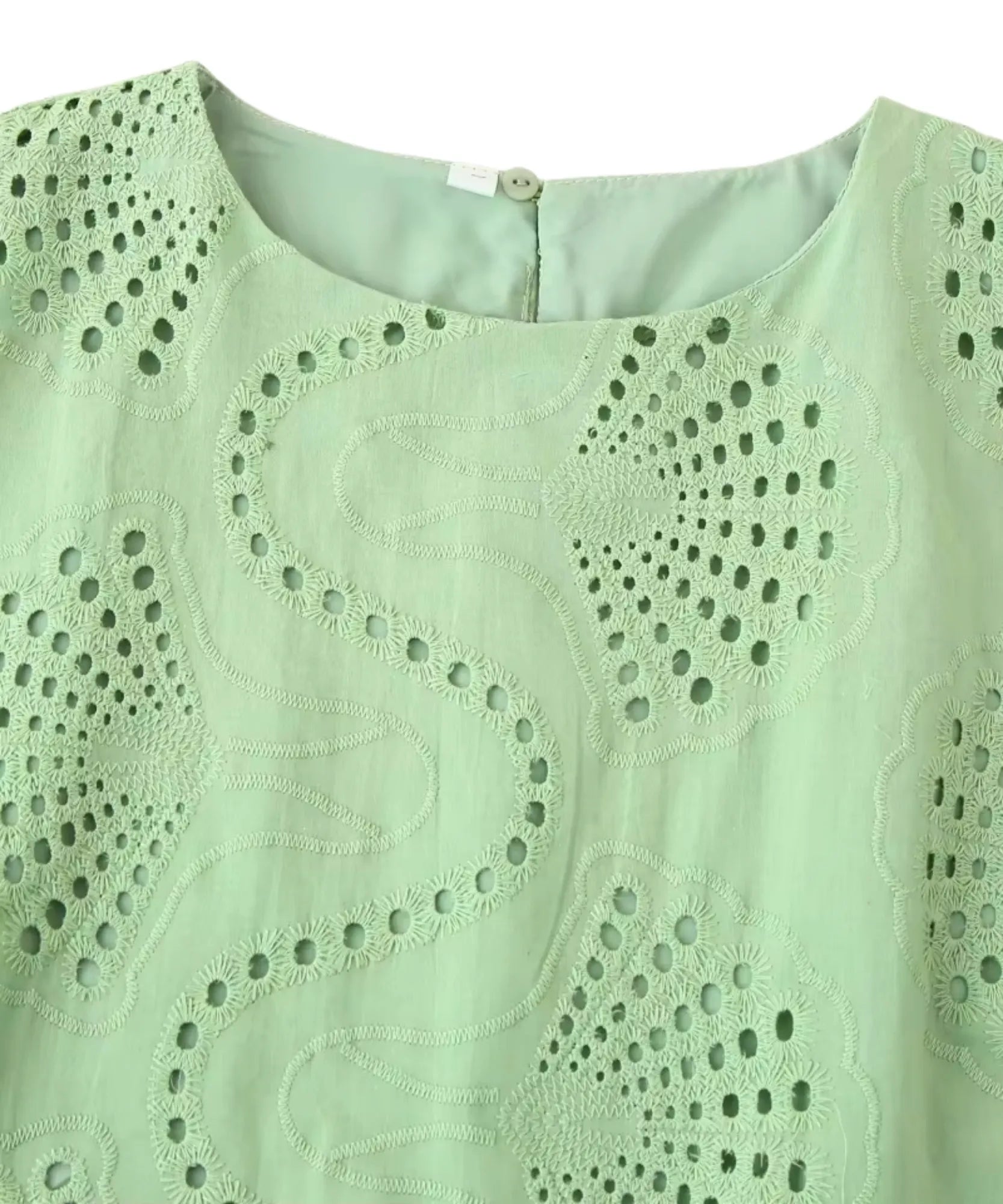 O bordado inglês vazado cria um jogo de transparências discreto, enquanto o top curto valoriza a silhueta de forma equilibrada.