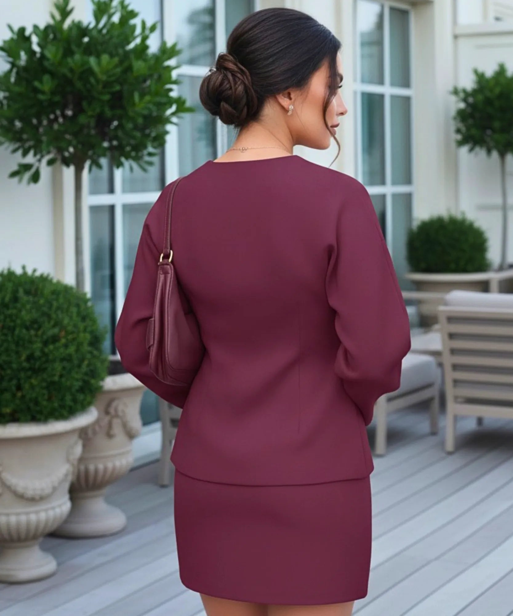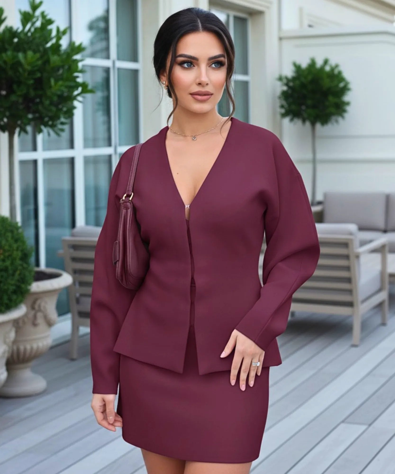 O cardigan alongado estruturado oferece cobertura elegante com fechamento frontal discreto, enquanto a saia midi cria silhueta feminina e sofisticada.