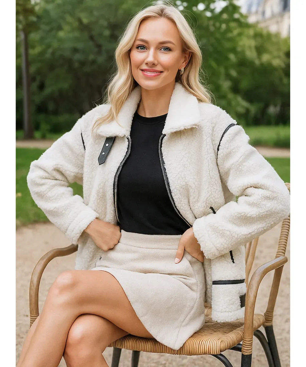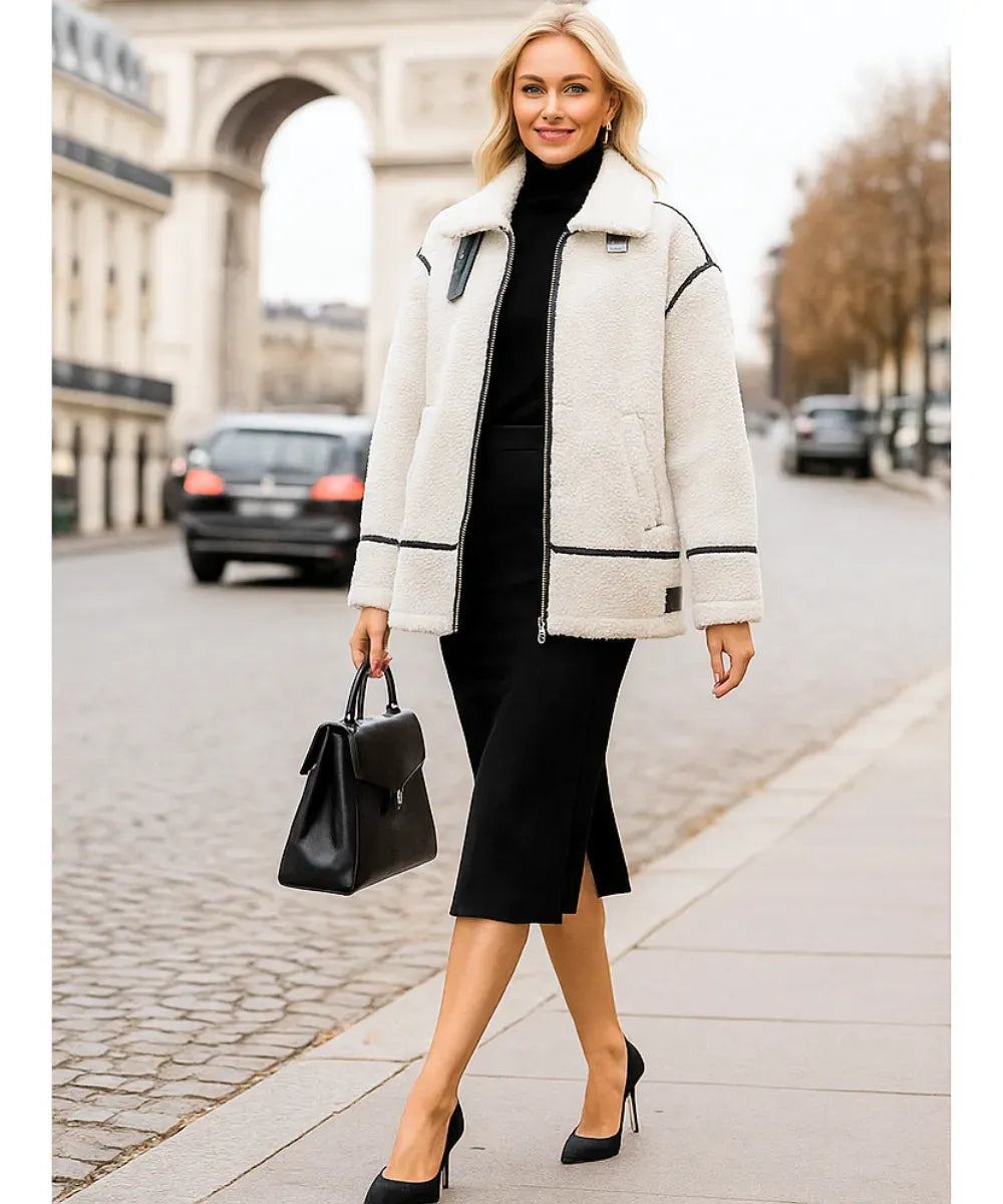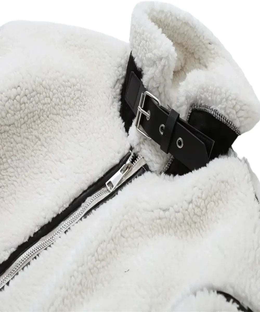 Forro sherpa, acabamento em couro sintético, gola alta estruturada com fivela – tudo foi pensado para valorizar seu look, sem abrir mão do aconchego.