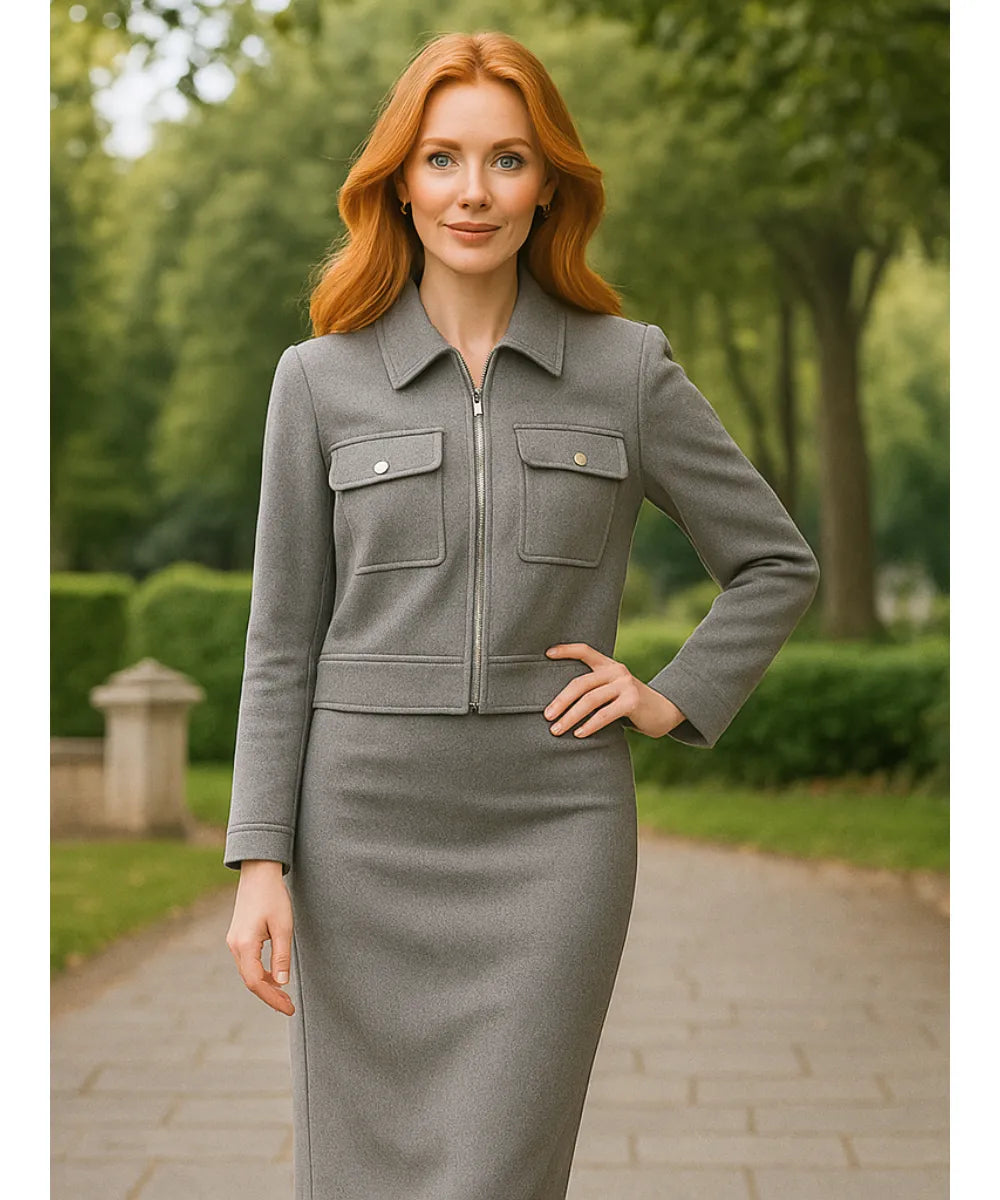 O recorte dessa jaqueta é sutil, mas estrategicamente pensado. A costura dos ombros e a gola estruturada criam uma silhueta limpa, atual e extremamente chique.