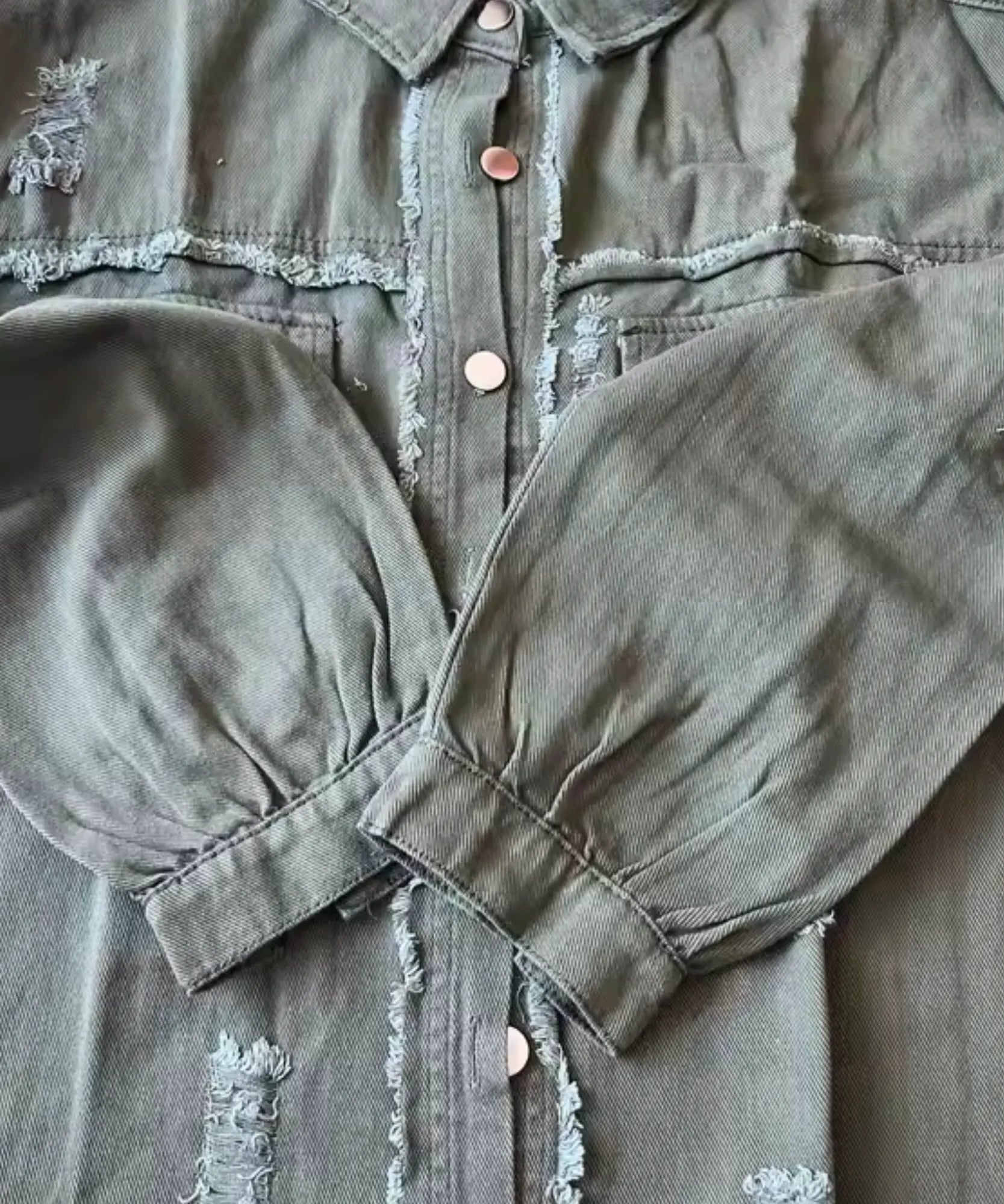 Não tem como não notar. Essa jaqueta tem uma pegada urbana marcante, com corte amplo e detalhes propositalmente desfiados, o que reforça a personalidade do look.