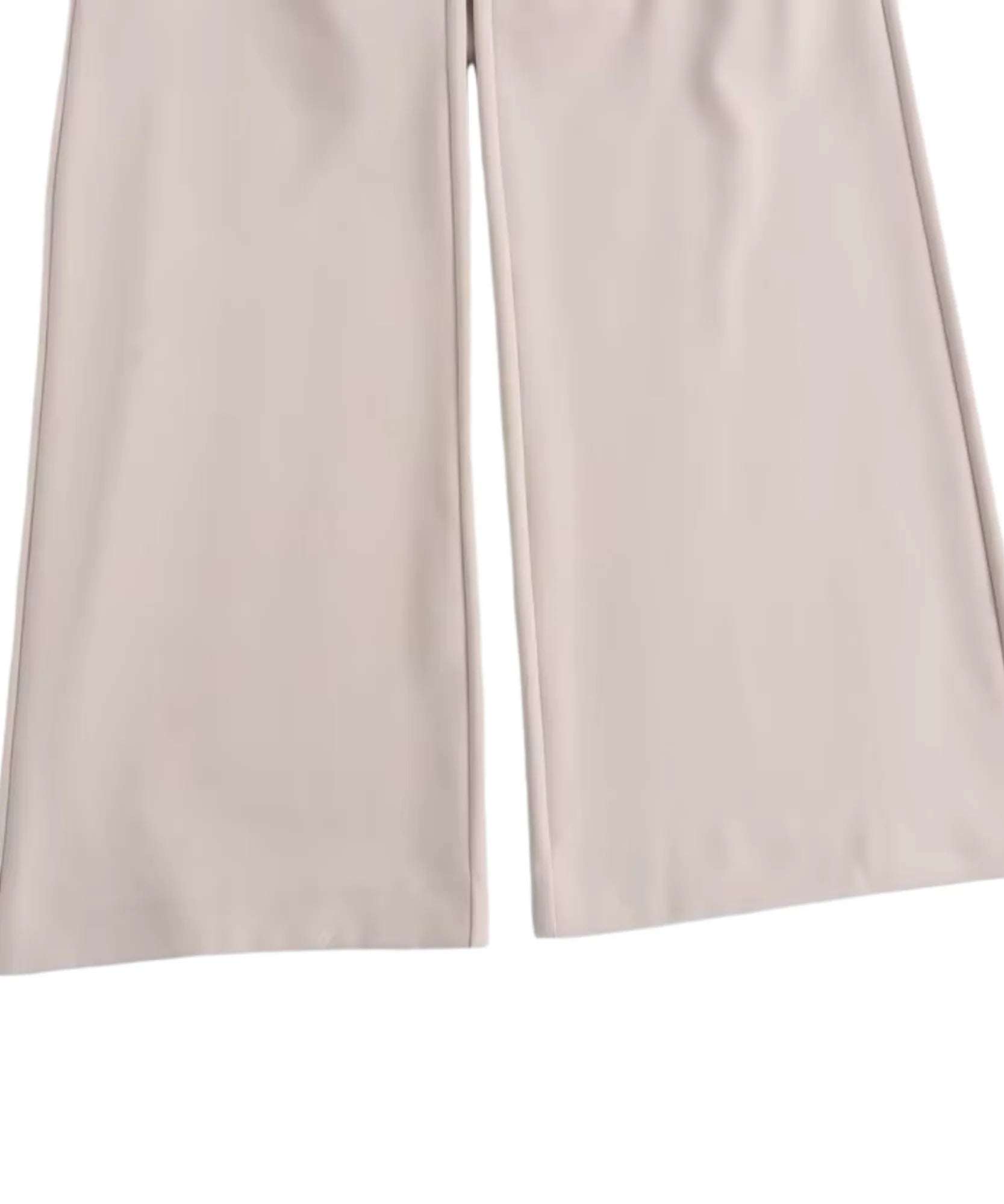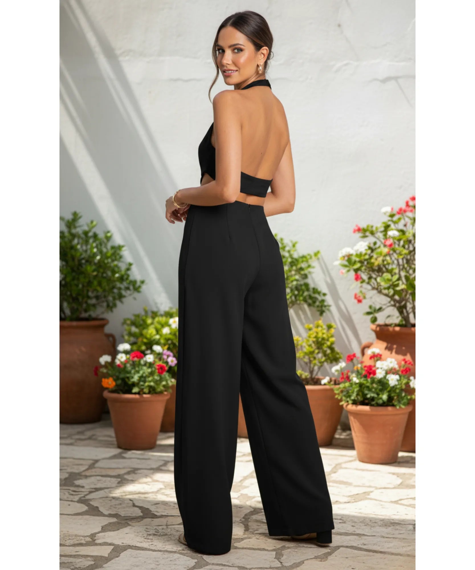 O recorte vazado na cintura cria um efeito visual que alonga a silhueta, enquanto a perna pantalona longa traz movimento e elegância.