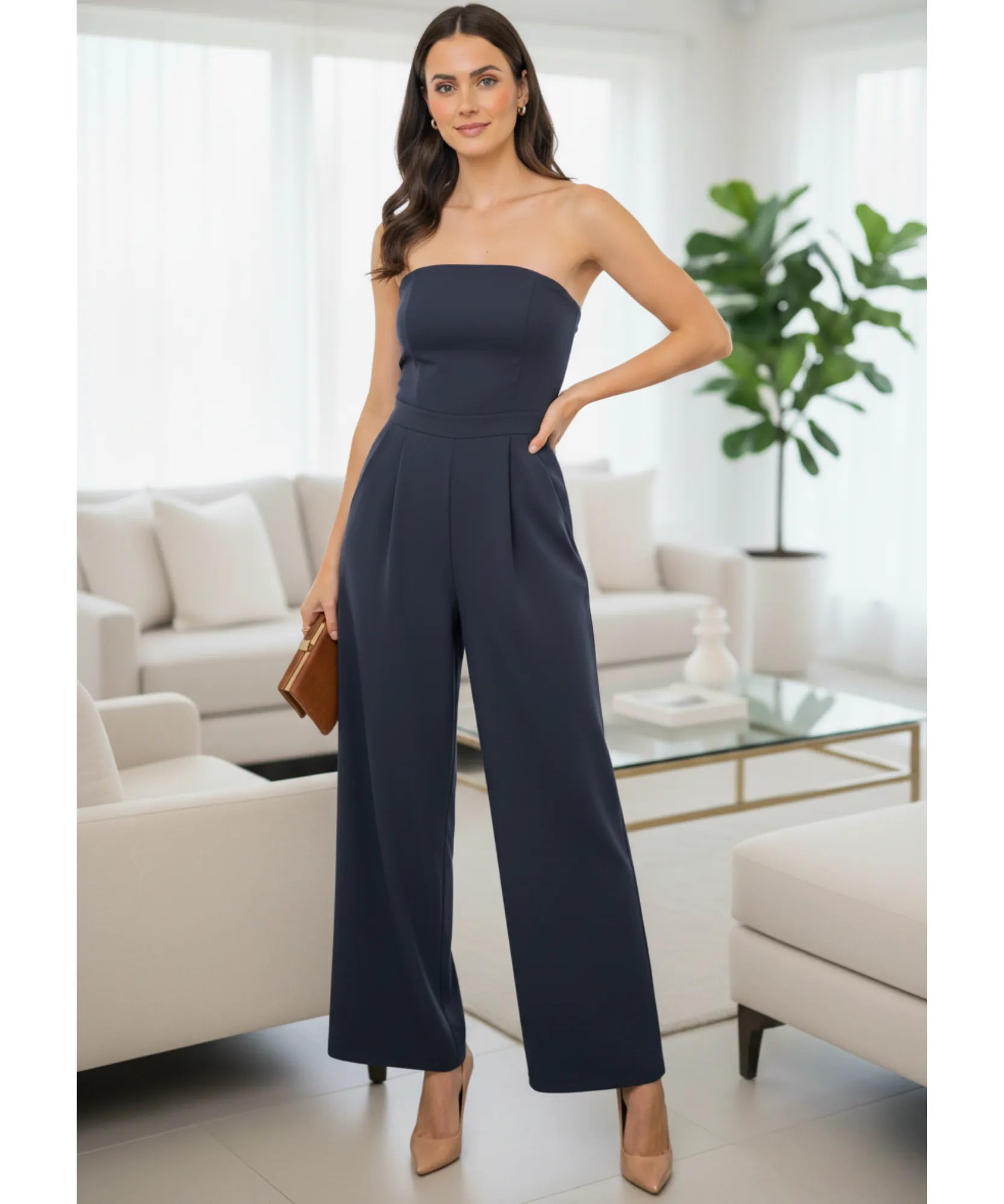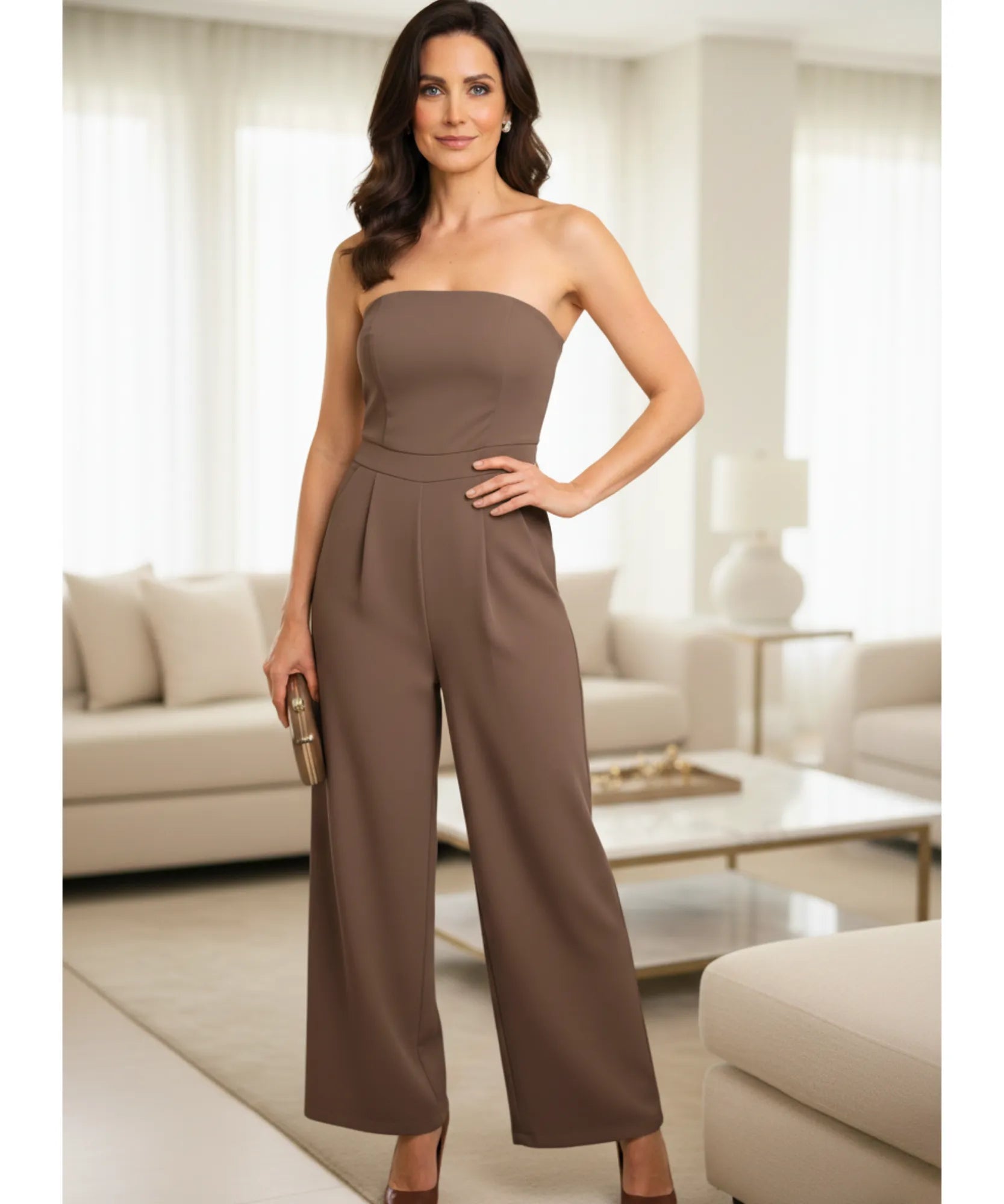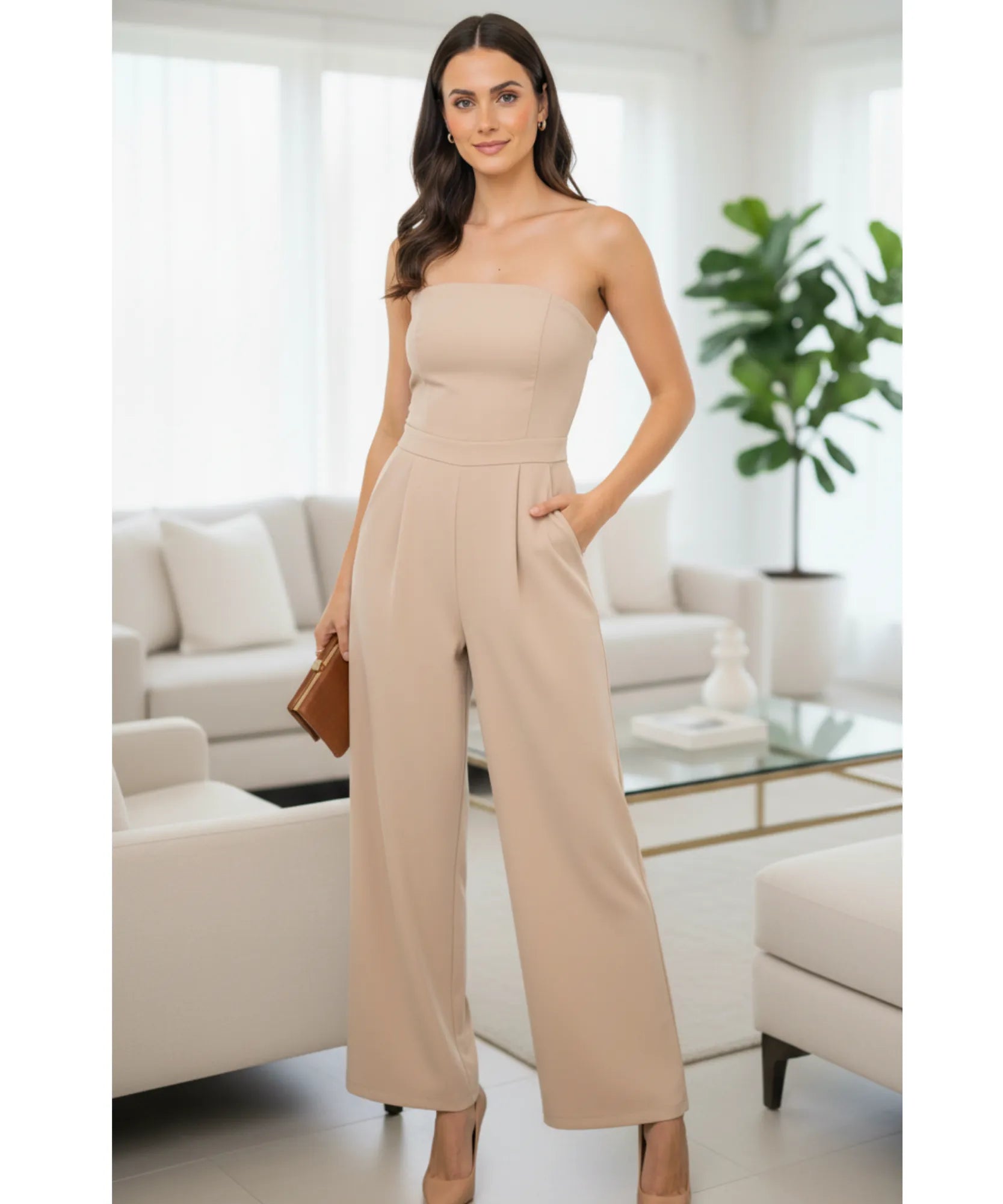 Este macacão feminino alfaiataria traz um design tomara que caia que valoriza o colo e os ombros de forma elegante.