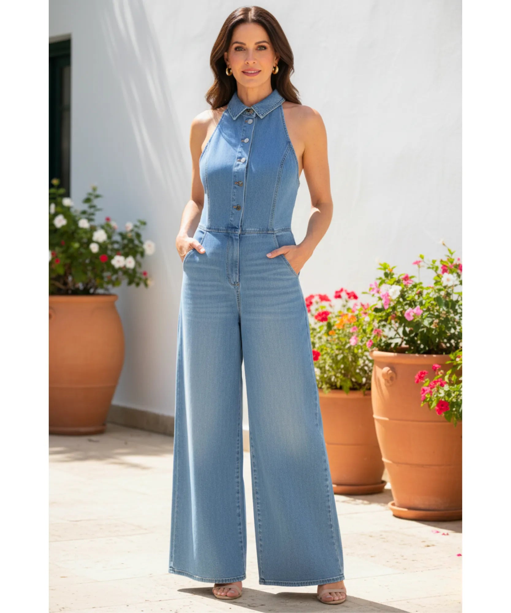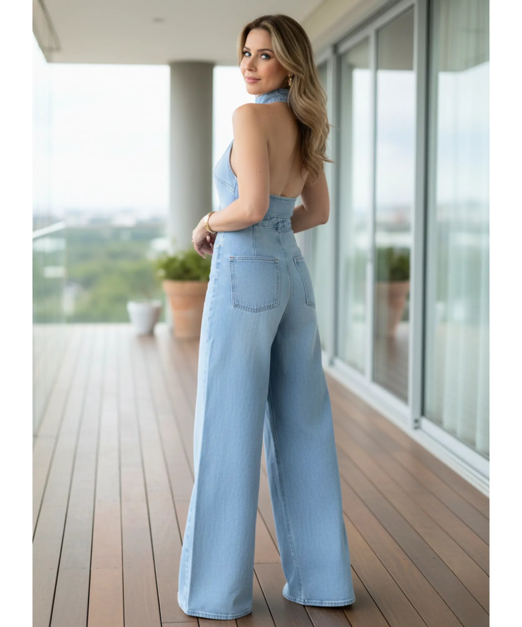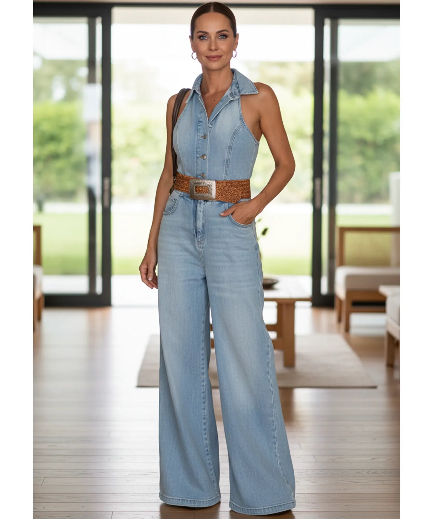 O macacão feminino jeans com perna larga pantalona traz aquele visual sofisticado sem perder descontração.