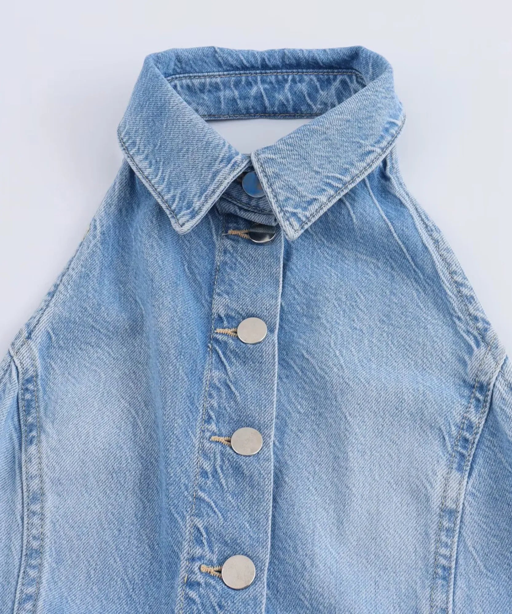 A gola de camisa estruturada adiciona elegância ao conjunto, enquanto os botões frontais metálicos permitem ajuste personalizado do decote.