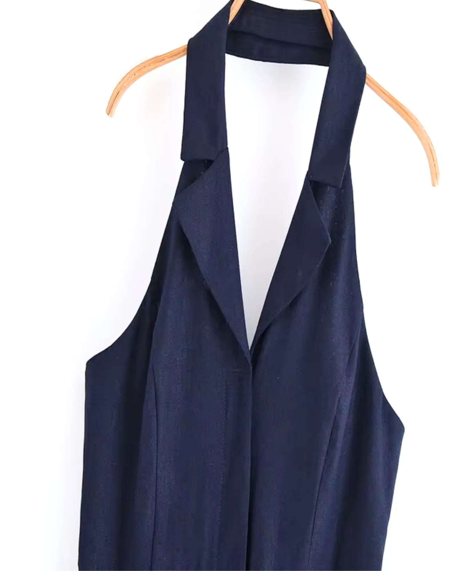 O decote frente única com gola estilo blazer cria um visual executivo refinado, enquanto o tecido em linho garante frescor durante todo o dia. Cada linha foi traçada pensando em quem busca elegância sem abrir mão do conforto térmico.