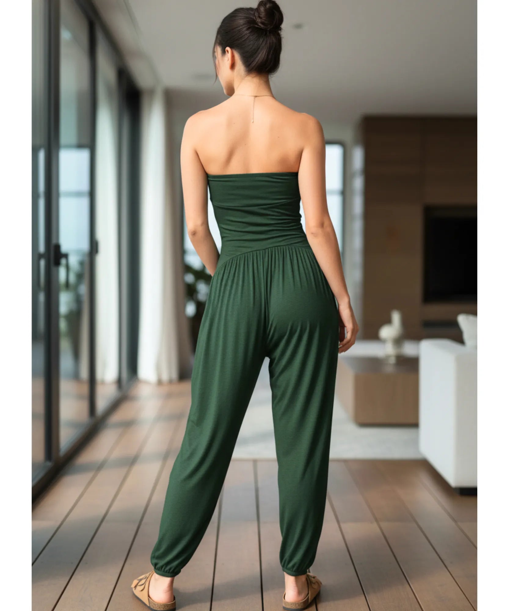 A composição equilibrada permite que o macacão longo se ajuste suavemente sem forçar, criando um caimento que realça sem marcar.