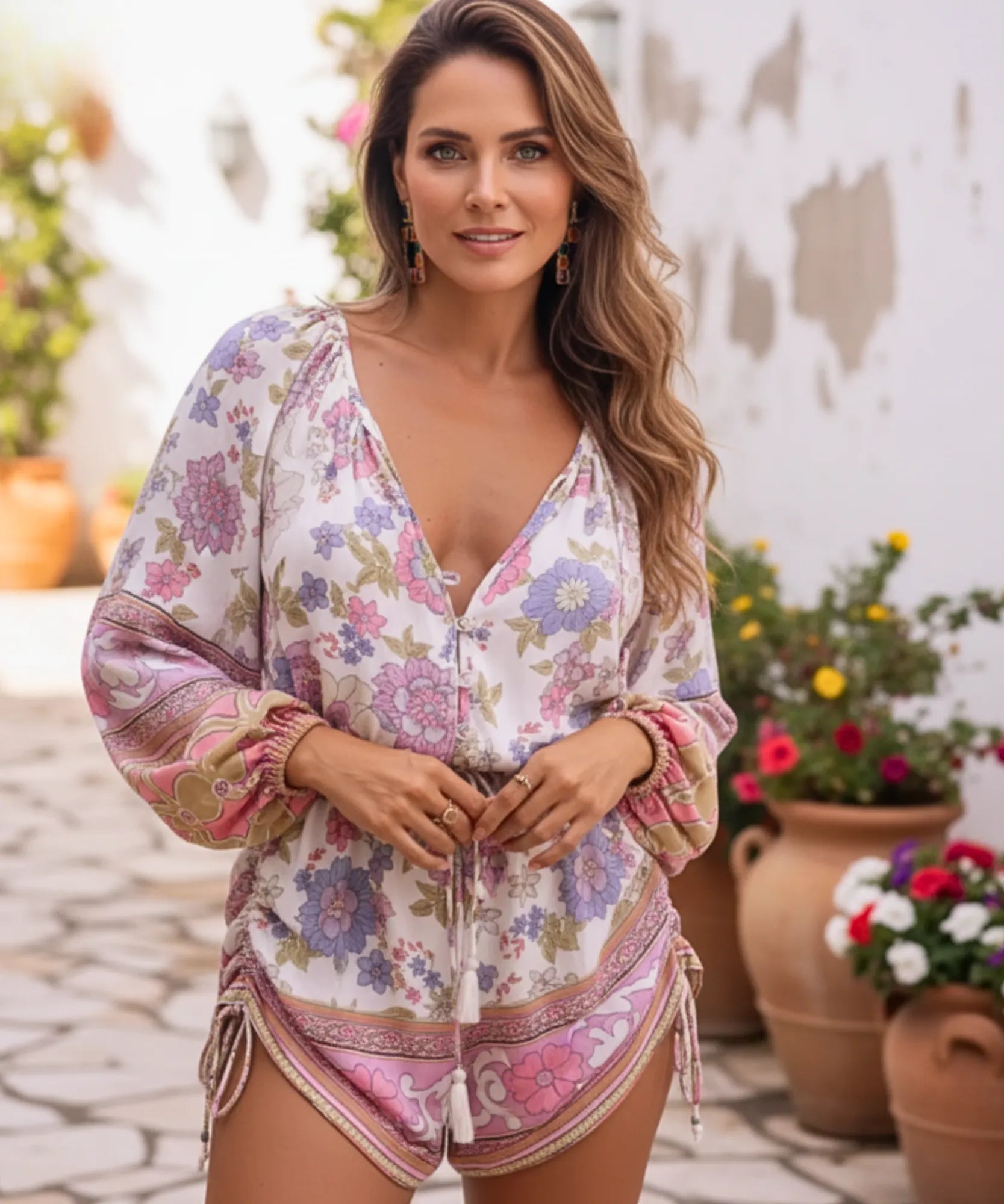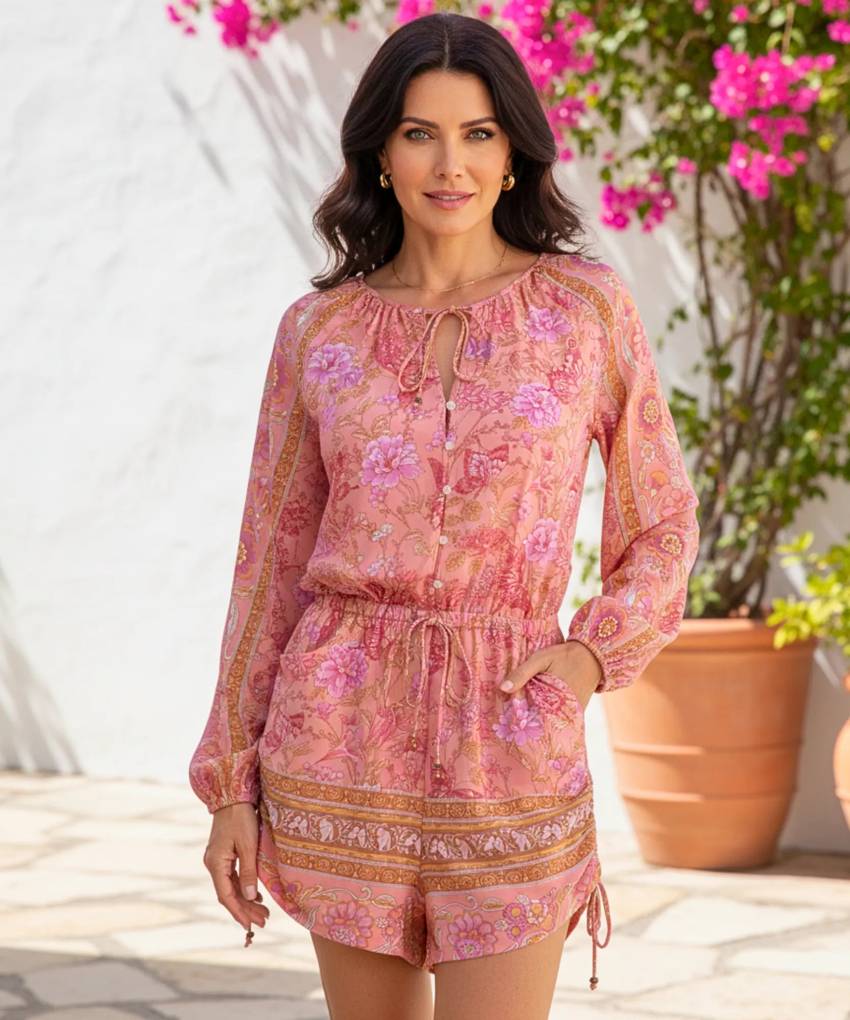 O macaquinho feminino com estampa floral traz aquele charme romântico sem exageros.