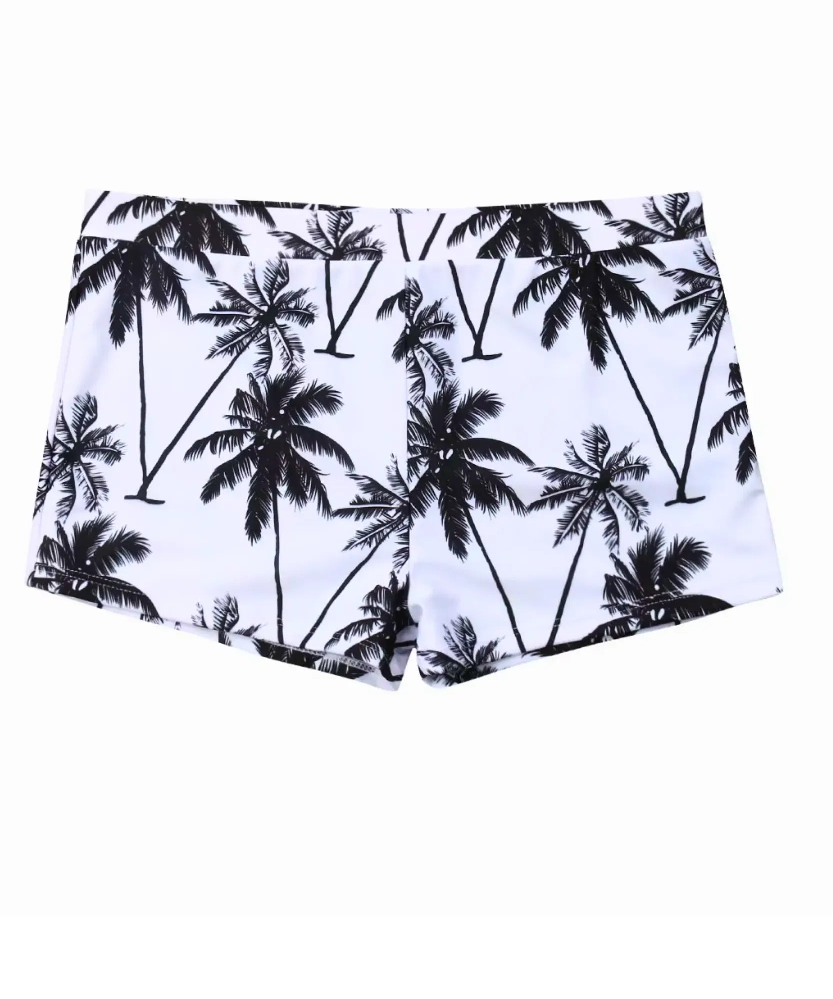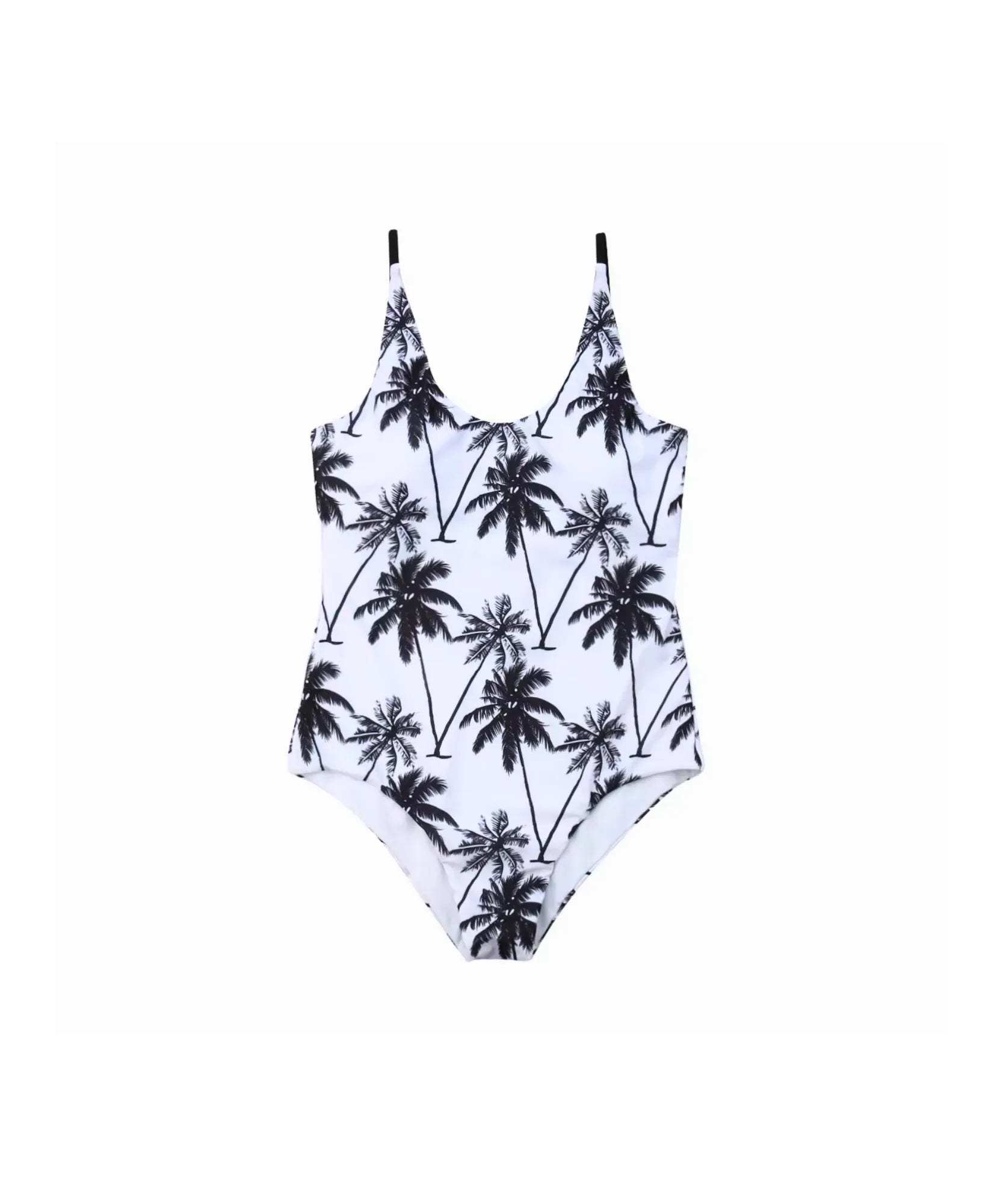 A estampa de coqueiros em preto e branco confere um visual sofisticado, enquanto o tecido em 85% poliéster e 15% elastano garante liberdade de movimento sem comprometer o caimento.