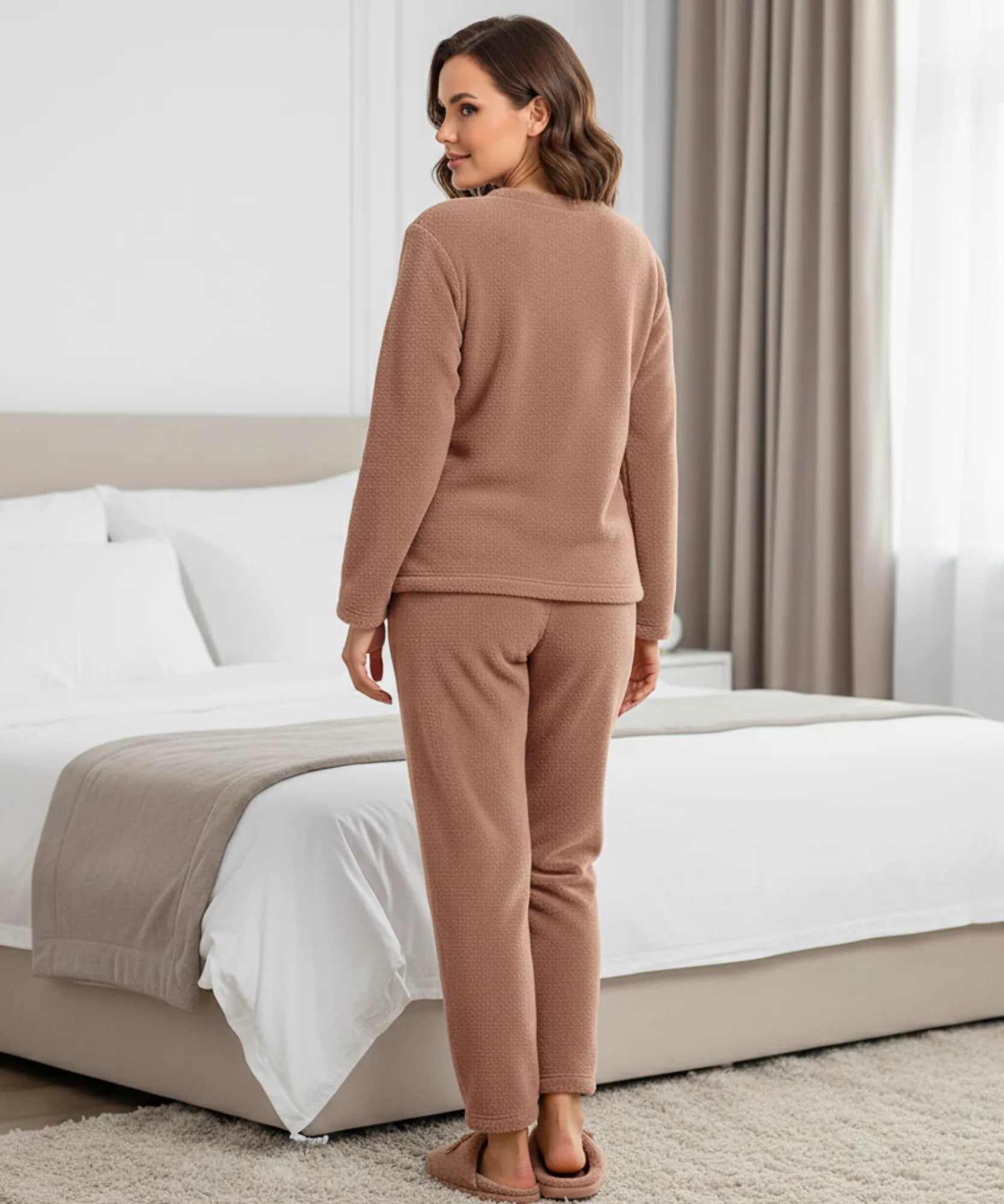 É o tipo de pijama feminino inverno que você veste e não quer sair mais. O conjunto fleece de textura plush envolve o corpo em uma camada macia que retém calor sem causar peso excessivo, enquanto o toque aveludado desliza suavemente na pele criando sensação de abraço térmico.