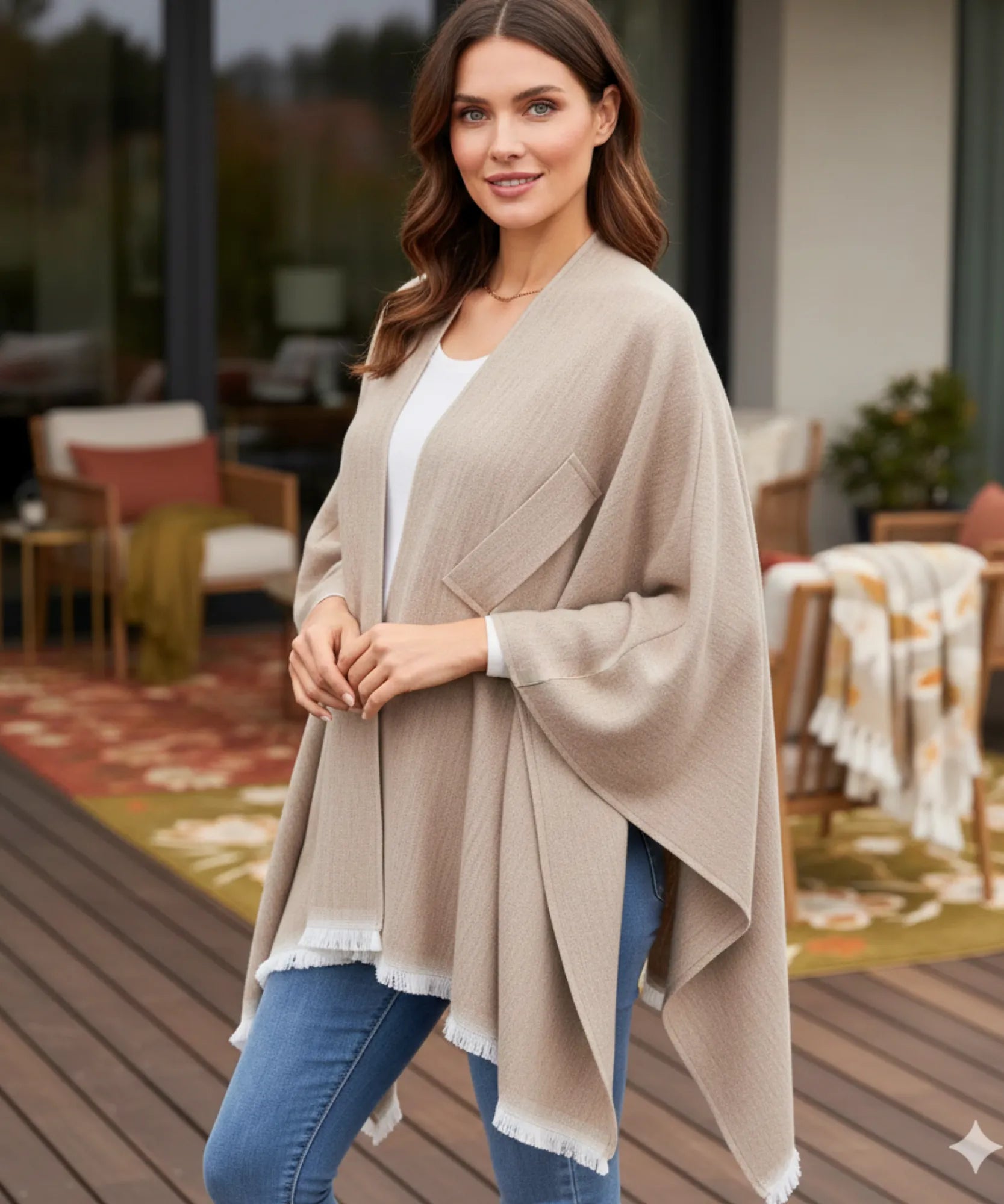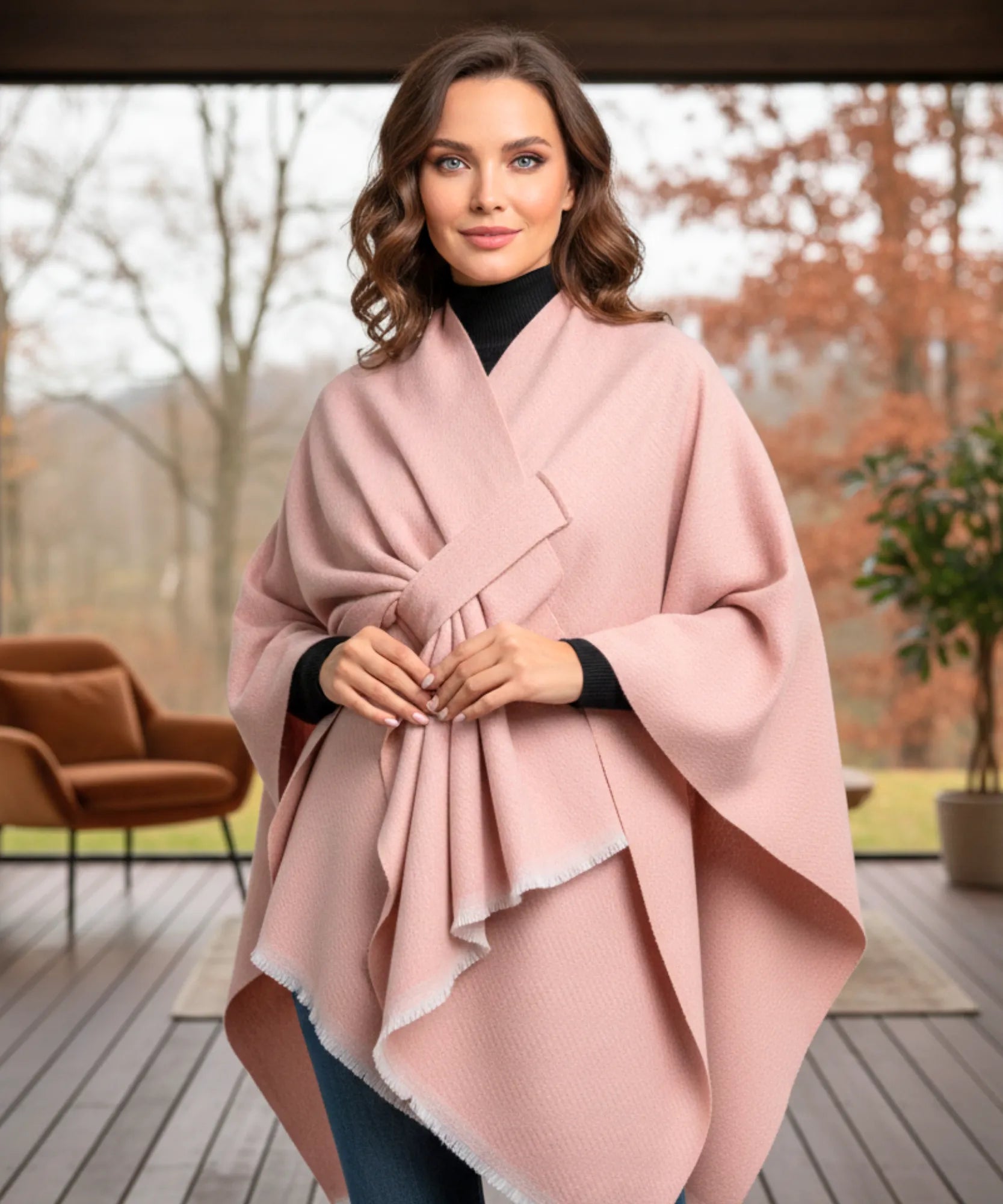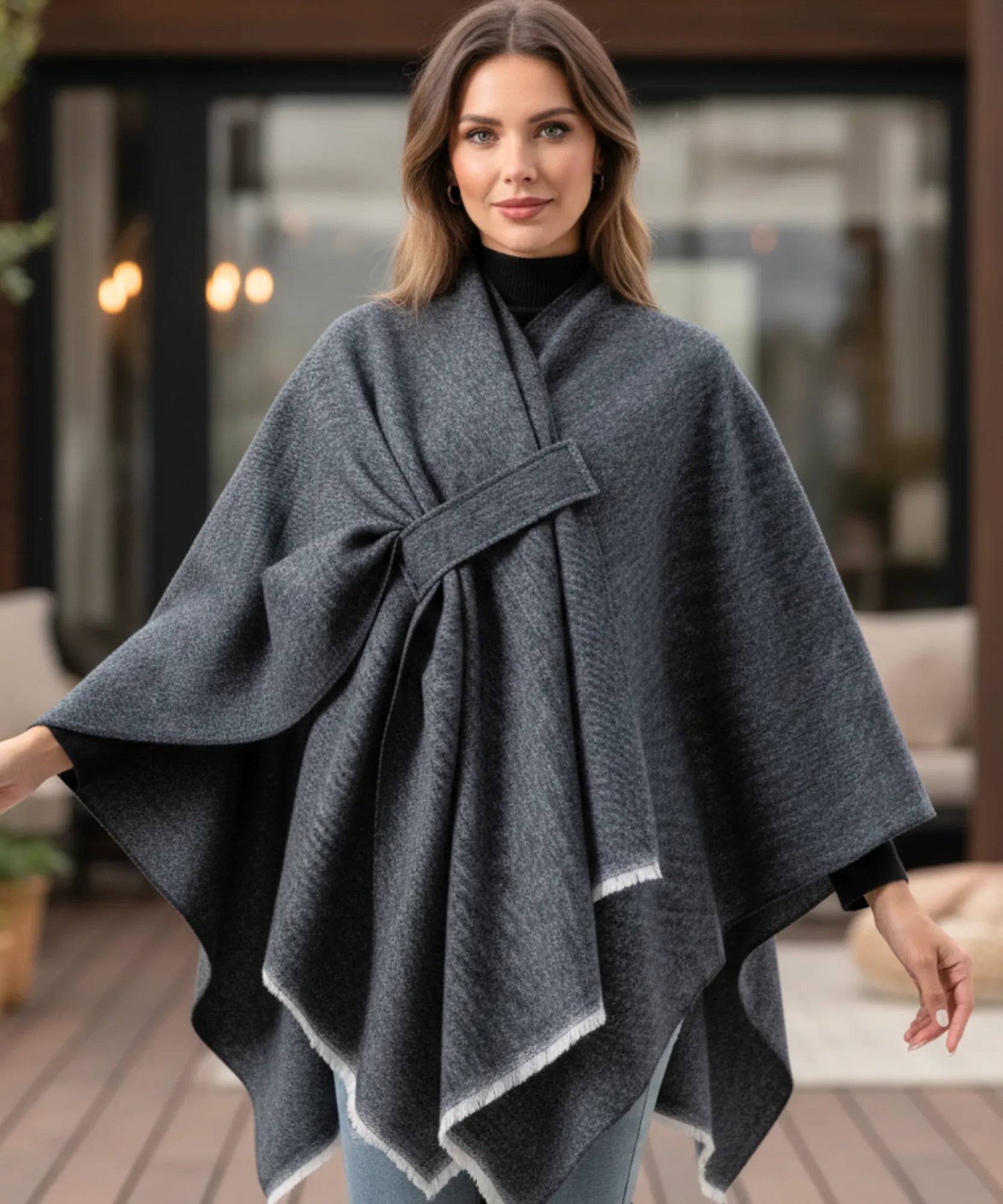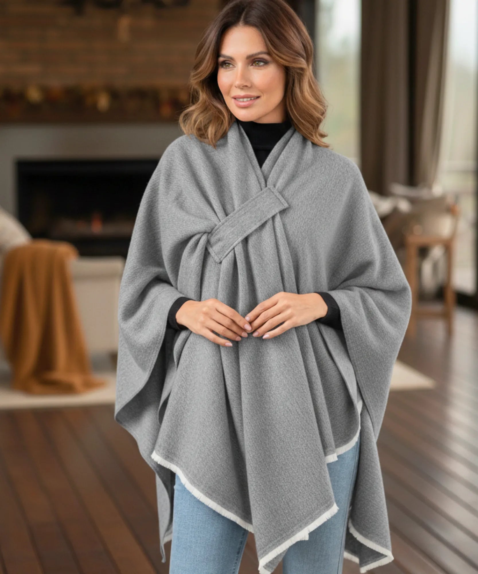 Este poncho feminino funciona perfeitamente em diferentes níveis de frio. Nas temperaturas amenas do outono, use sozinho sobre blusas básicas. Quando o inverno aperta, sobreponha casacos por baixo – o formato amplo acomoda camadas extras sem apertar.