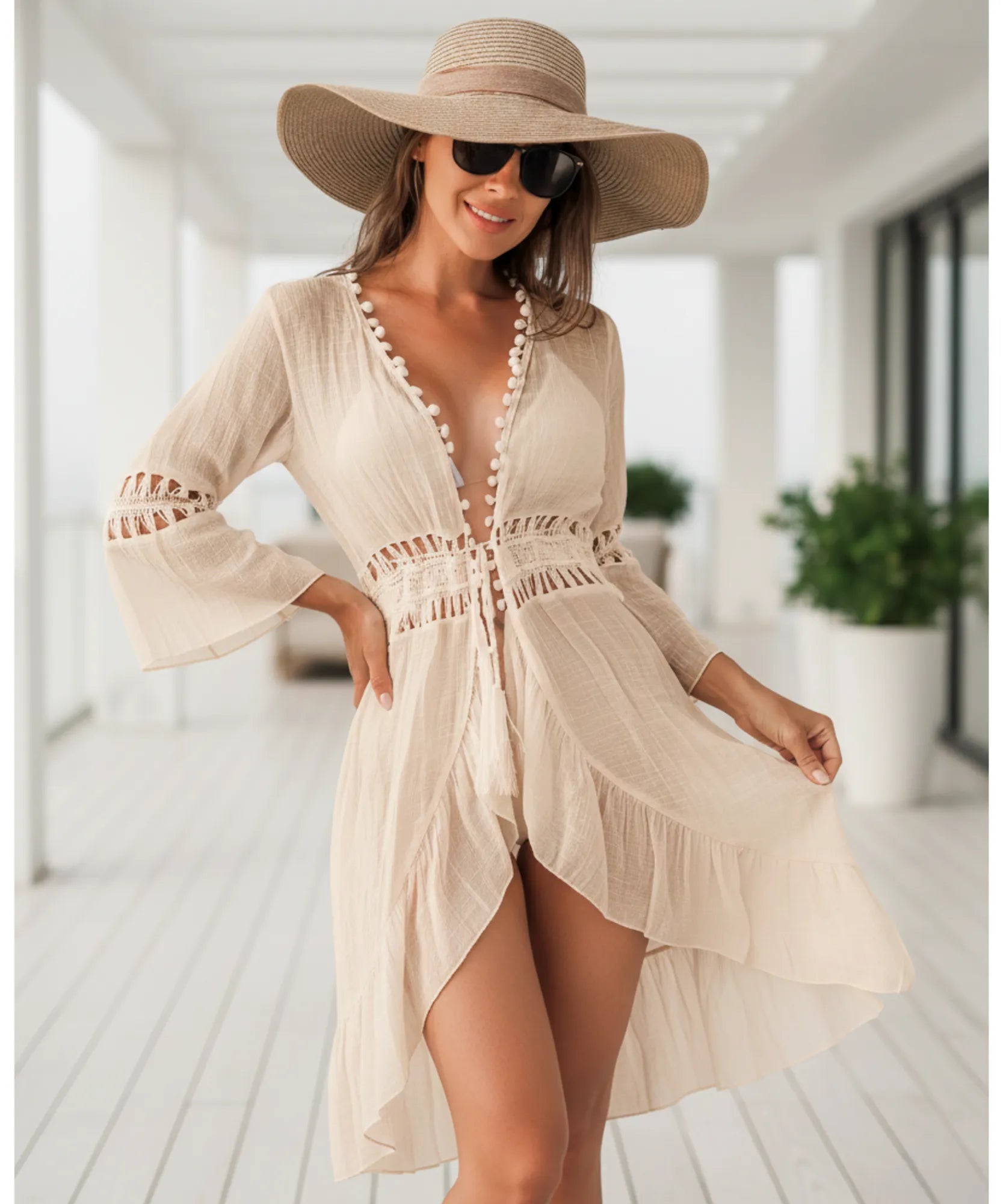 O decote V profundo decorado com pompons alonga visualmente o tronco, enquanto a amarração frontal permite ajustar o fechamento conforme necessidade. A
