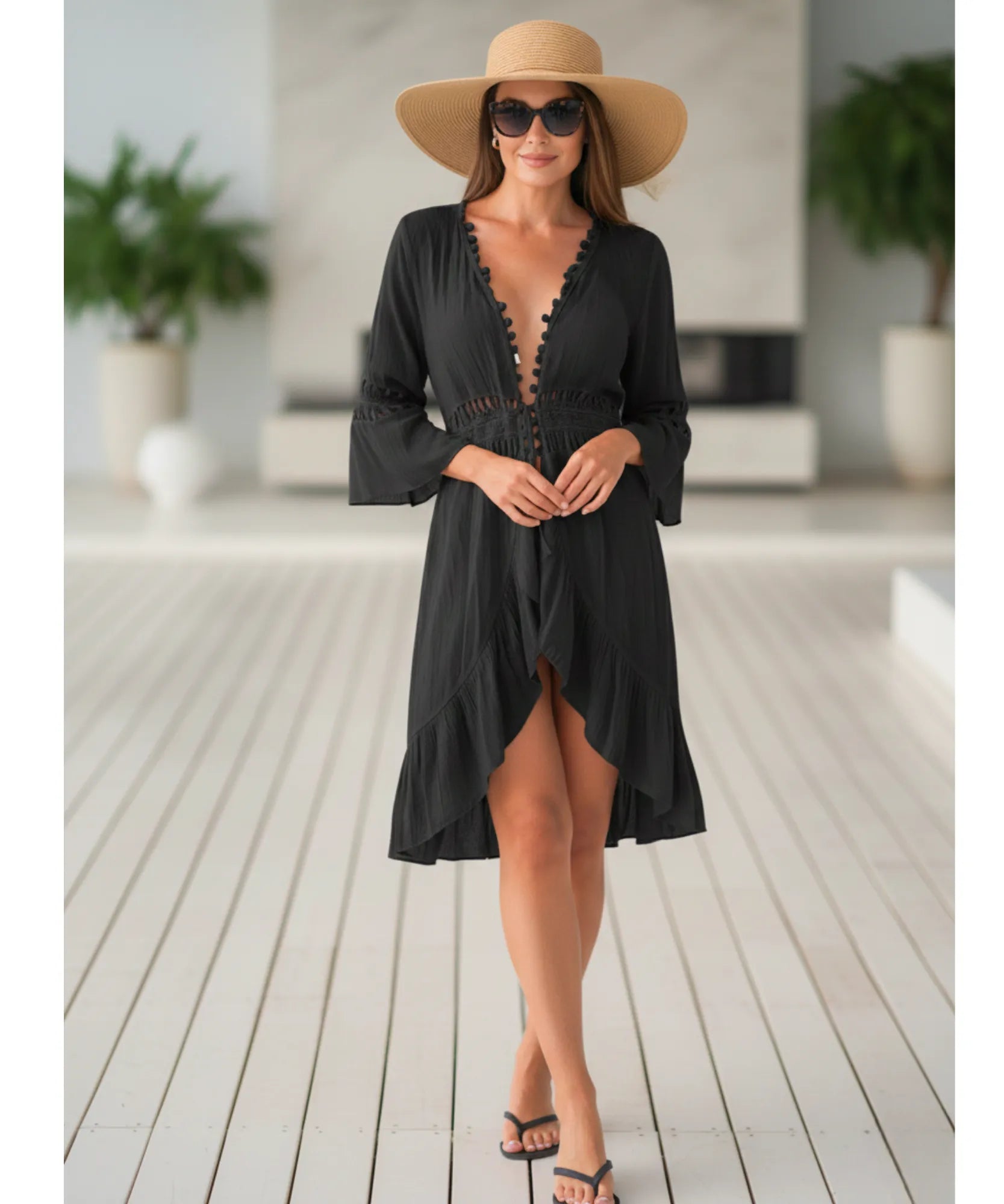 Funciona perfeitamente como cobertura elegante sobre maiôs na praia, mas também pode ser usada como vestido casual com shorts por baixo em passeios urbanos.