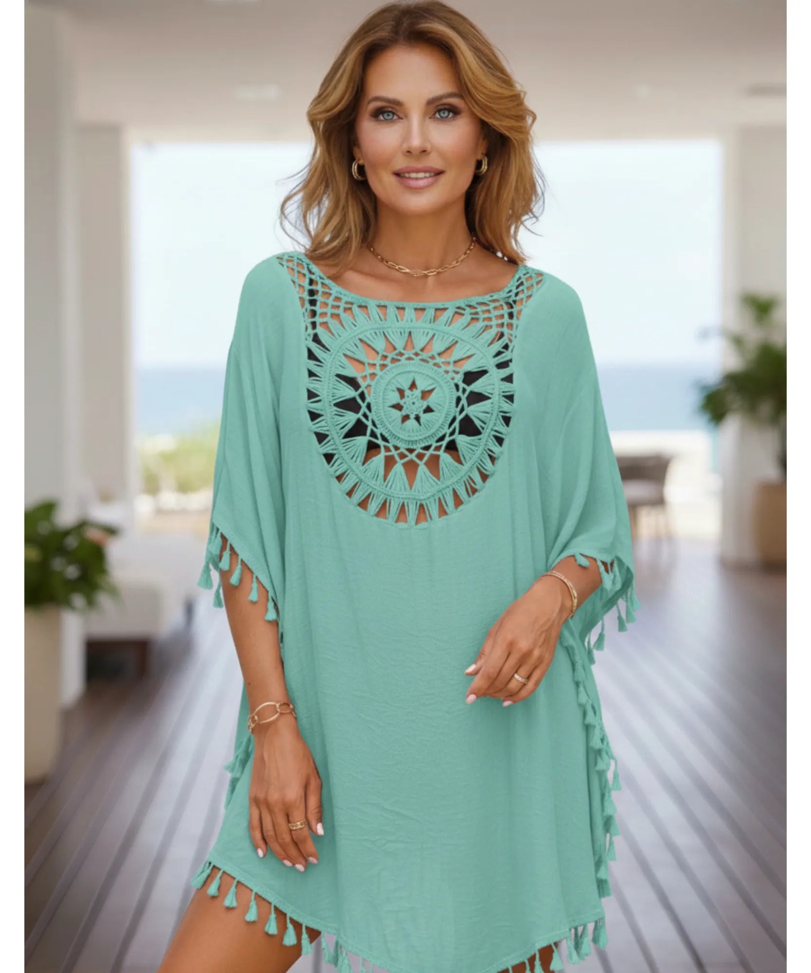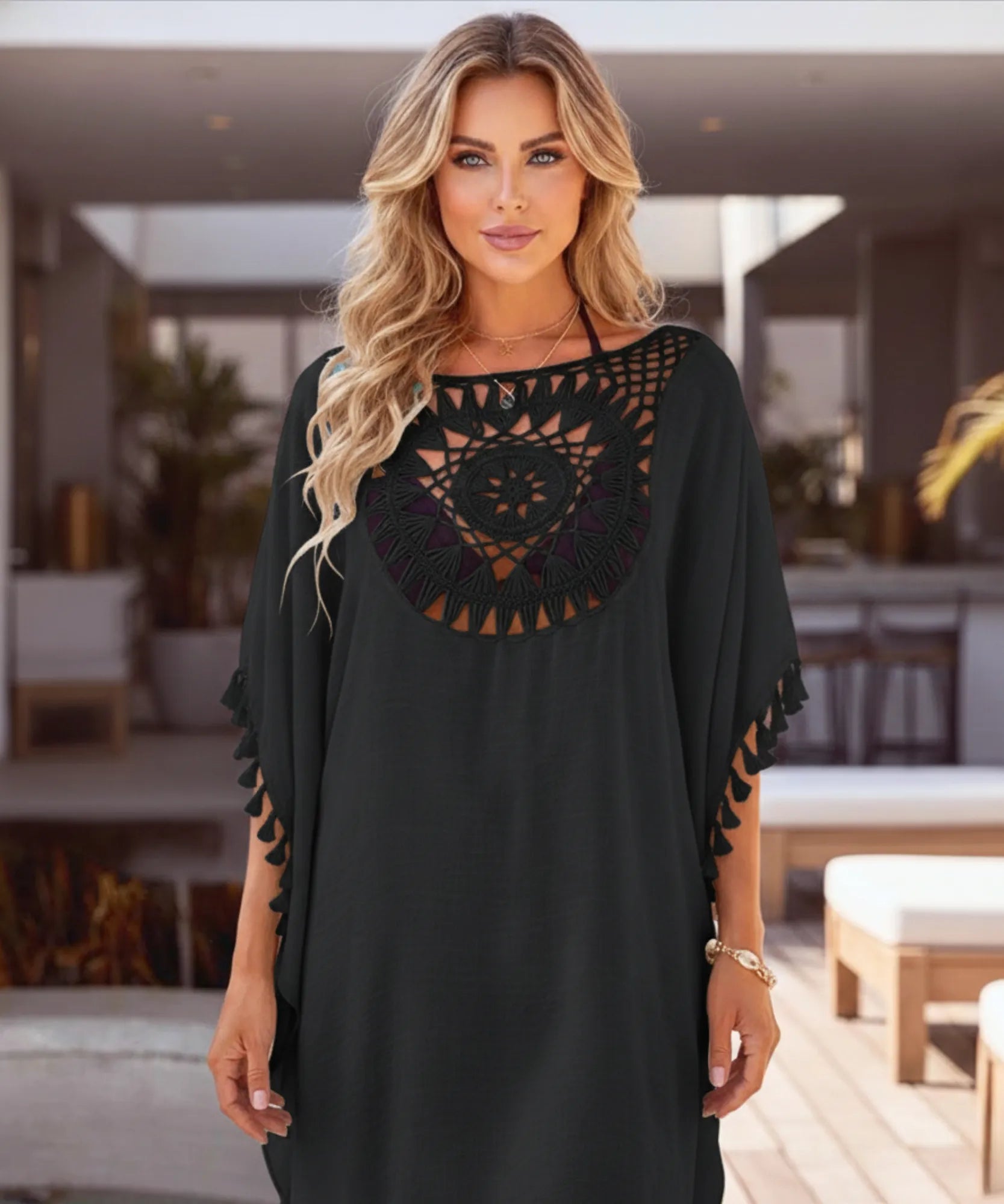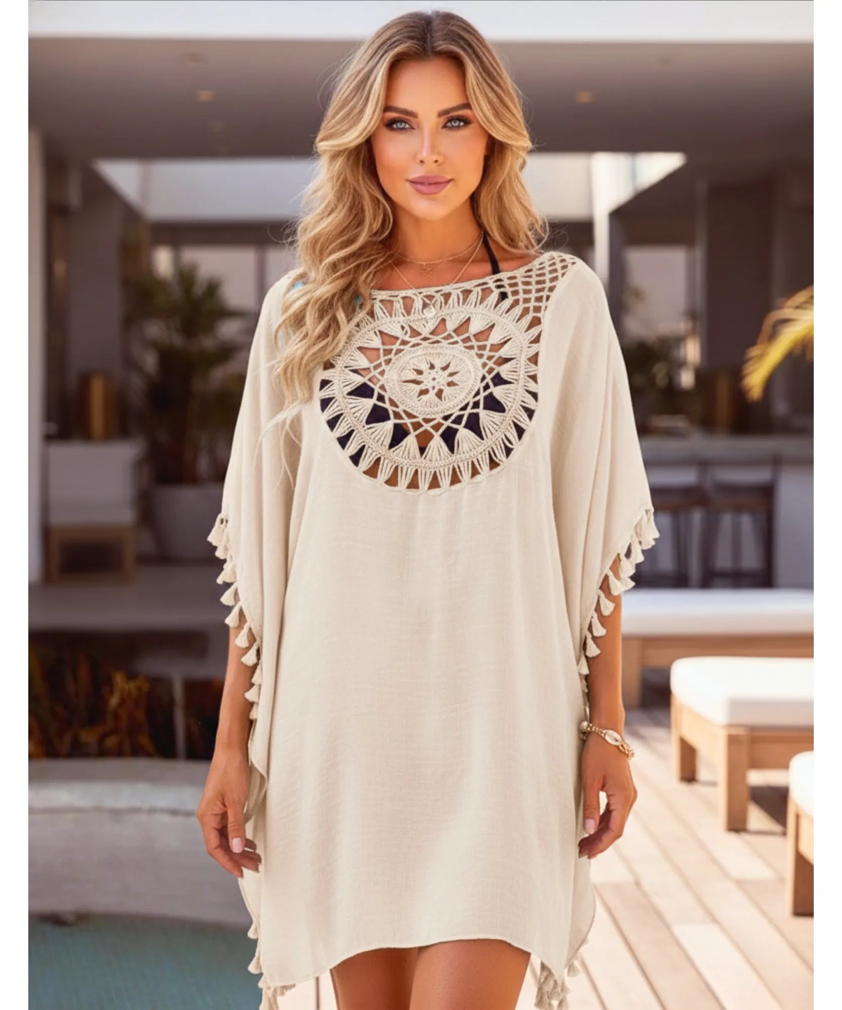 Uma saída de praia curta no estilo kaftan que valoriza a liberdade de movimento sem abrir mão do charme.