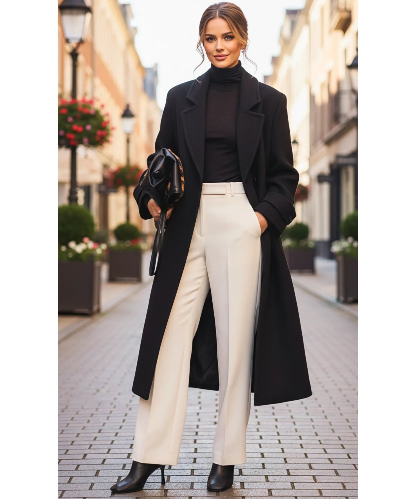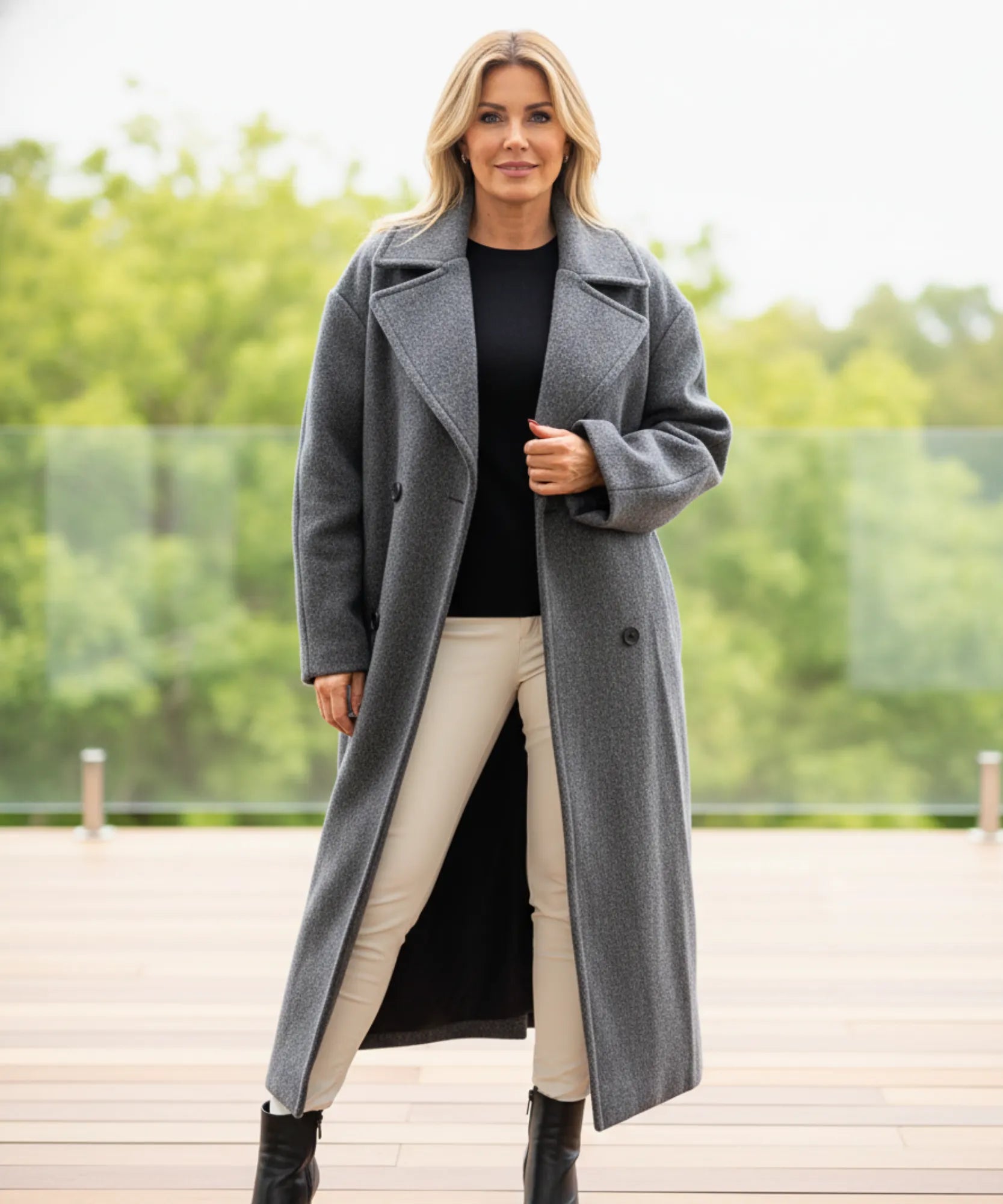 A modelagem alongada valoriza a silhueta e o tecido grosso realça o estilo em dias frios.