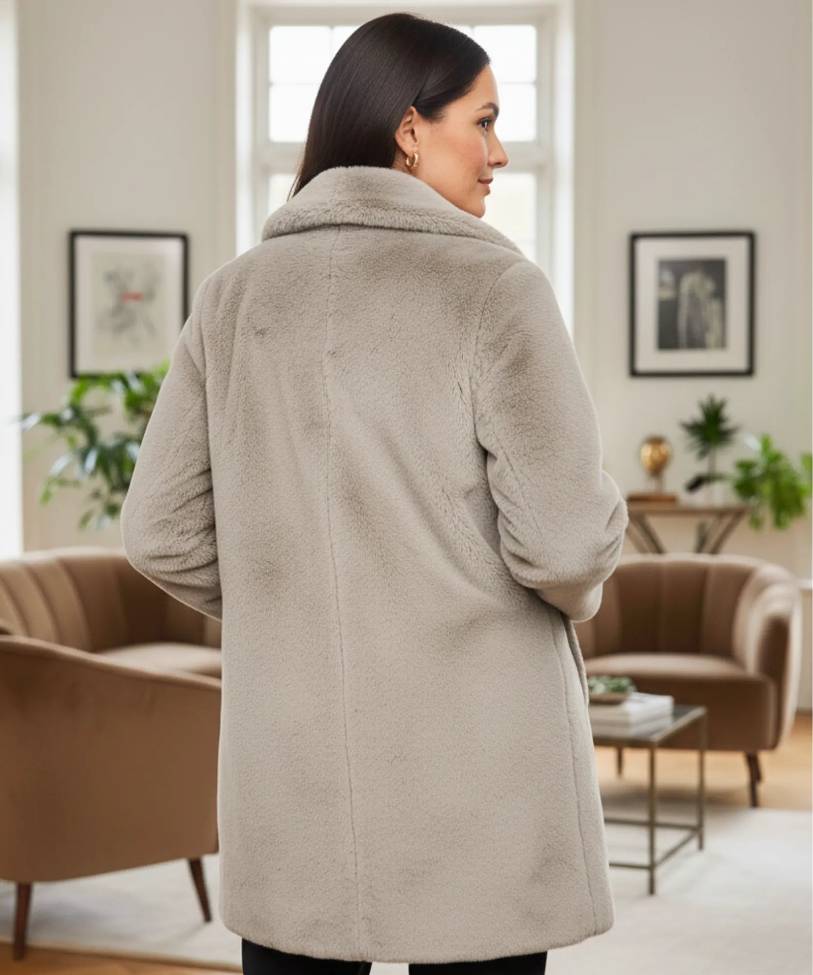 Esse não é qualquer casaco: é um sobretudo feminino com pelúcia premium, daqueles que você nota a diferença assim que toca.