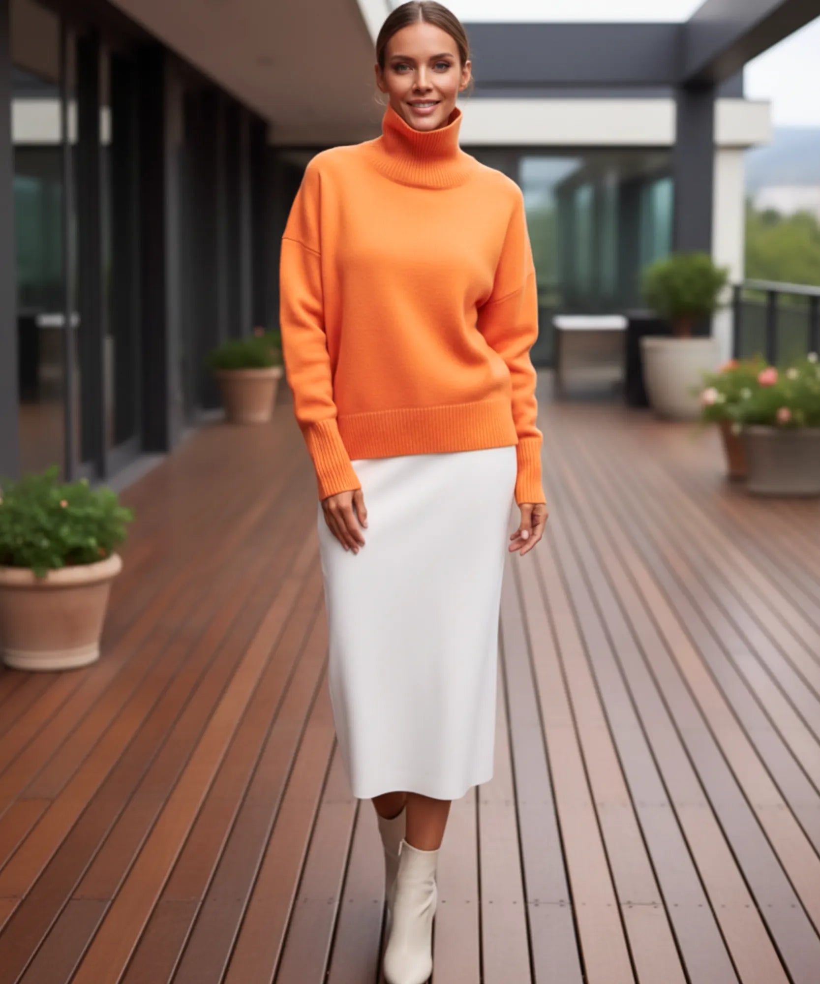 Este suéter feminino tricot gola alta traz aquela combinação rara: modelagem oversized que valoriza sem apertar, tecido macio que abraça o corpo com leveza e um caimento impecável que funciona do escritório ao happy hour.