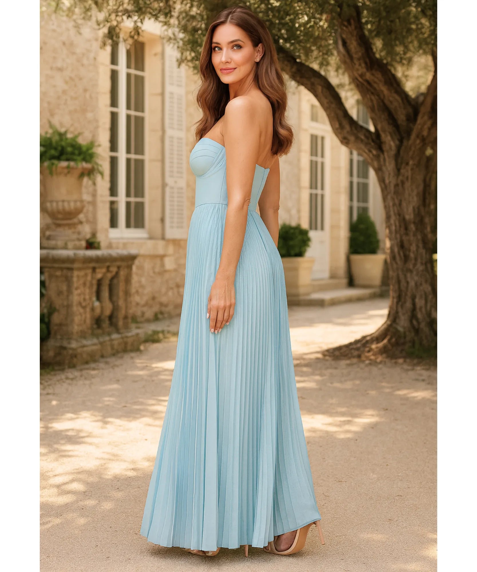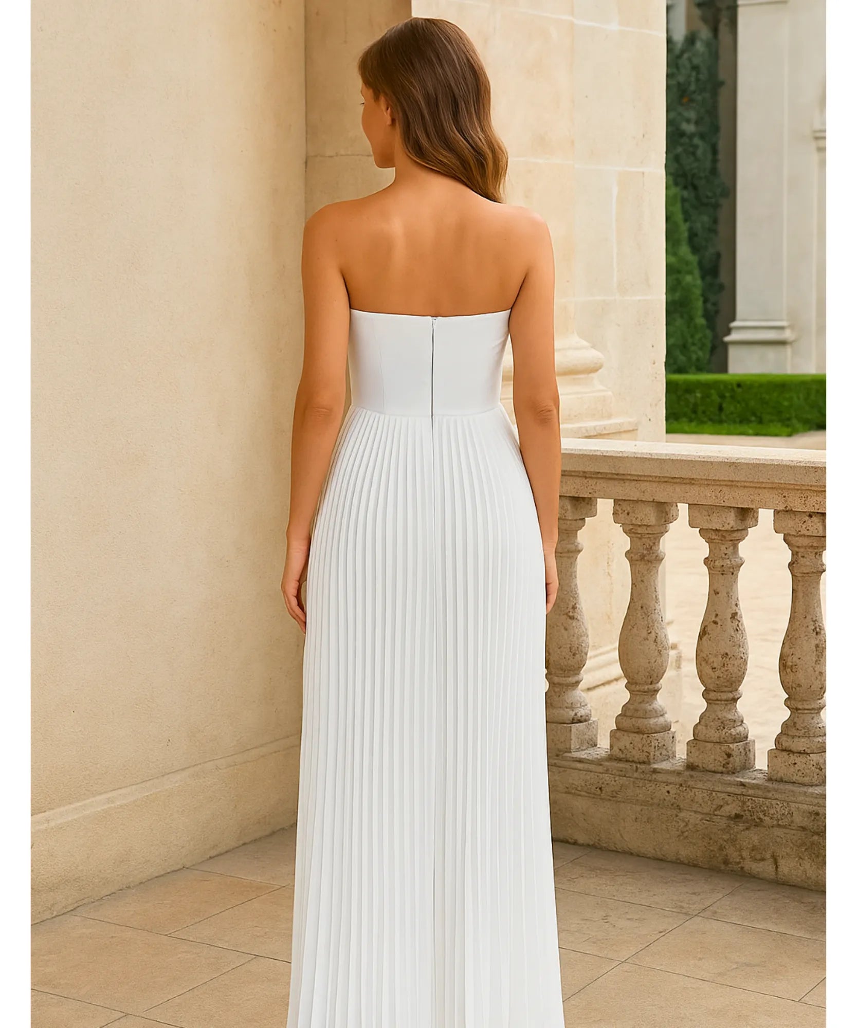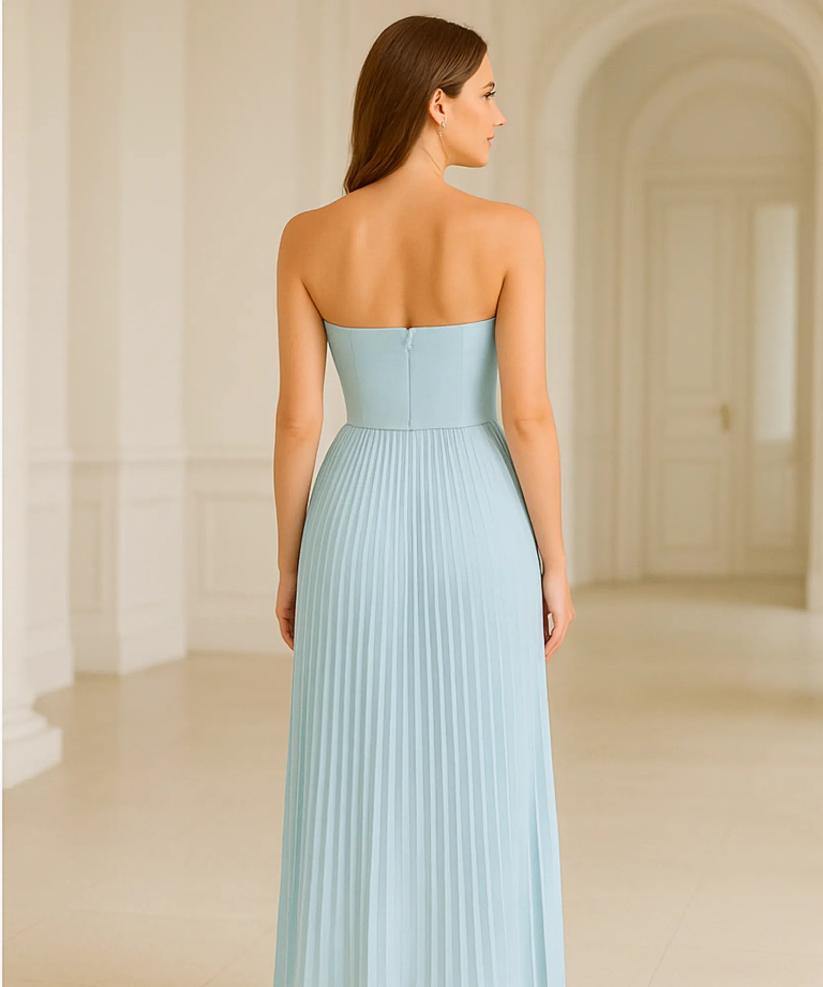 O modelo tomara que caia cria um visual impecável que valoriza o colo e os ombros de forma natural.