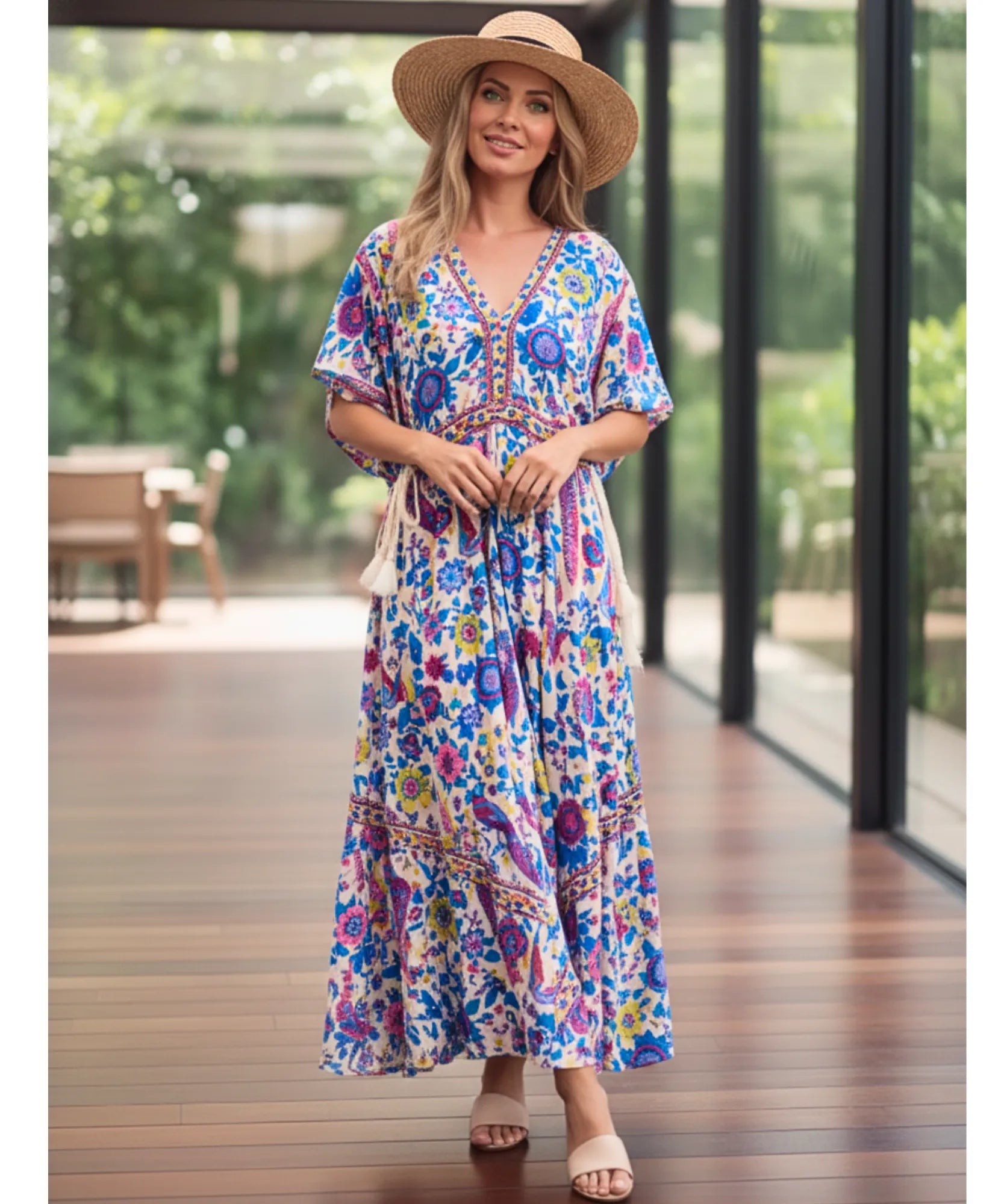 O vestido longo boho feminino de viscose estampado é daquelas peças que combinam elegância natural e conforto sem esforço.