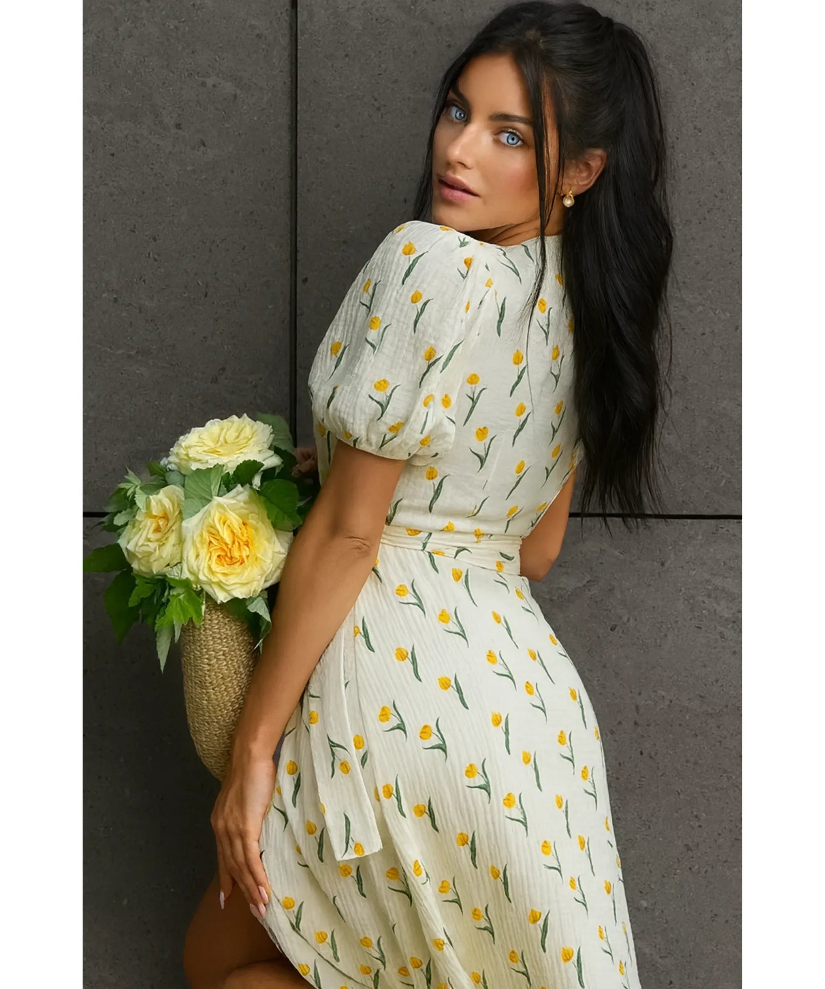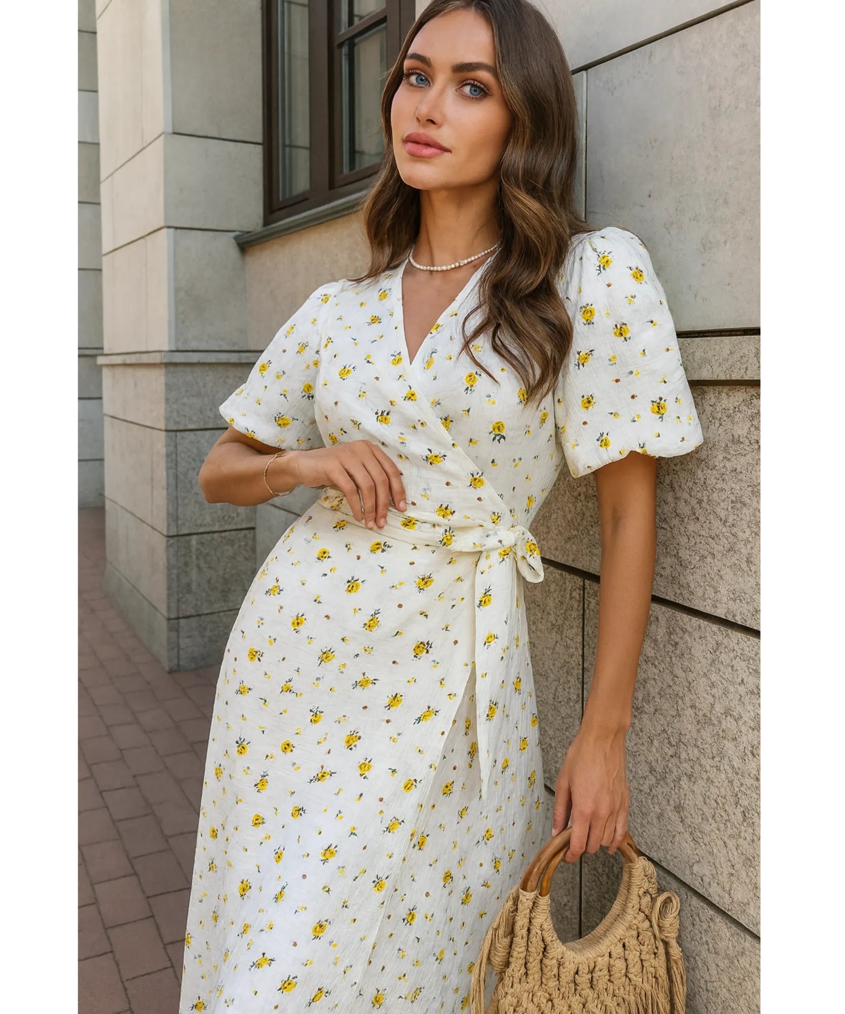 O modelo transpassado realça a silhueta de forma natural, enquanto a manga bufante adiciona charme vintage ao visual.
